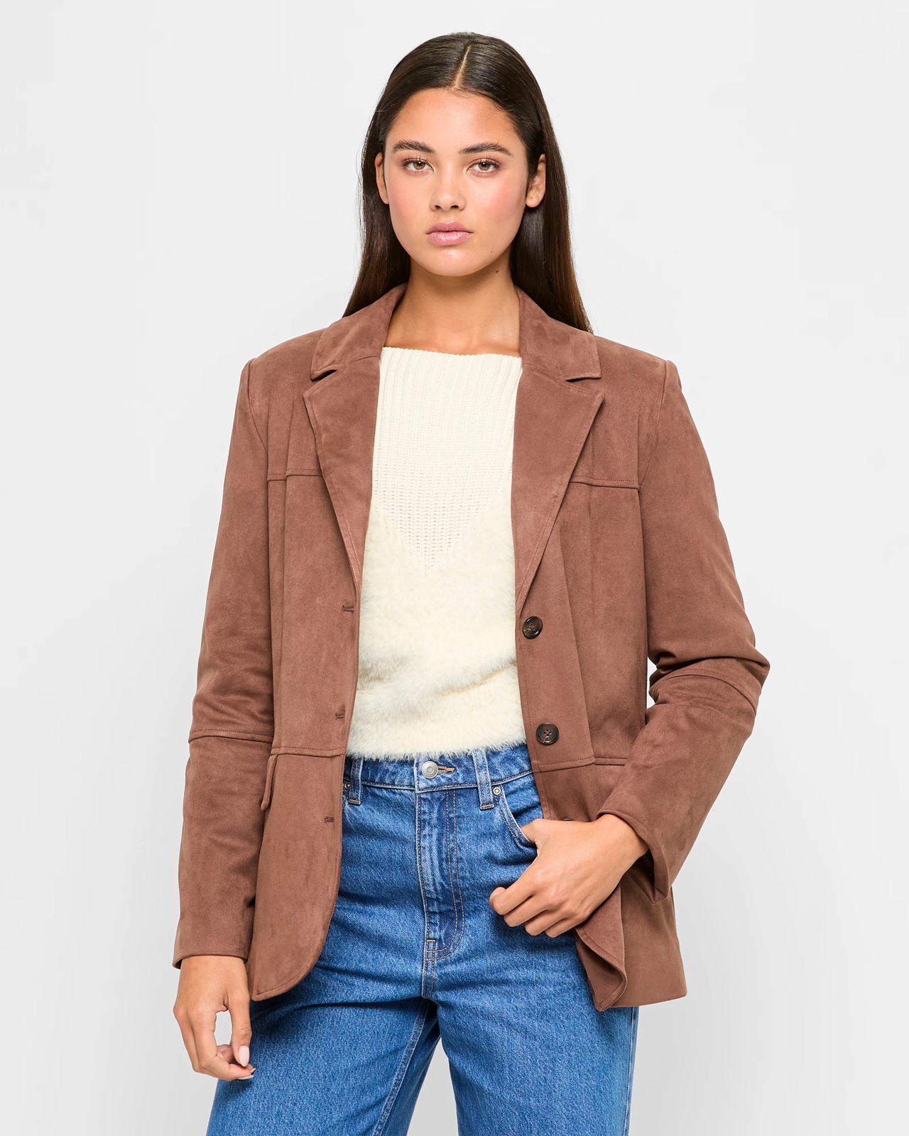 Step into sophistication with the Lily Loves Faux Suede Blazer. Made from a rich polyester blend with added stretch for ultimate comfort, this piece is perfect for any occasion. Featuring an inner lining and an outer suede look in stunning cocoa brown, it offers a tailored fit that compliments any silhouette. The classic design includes a round collared neckline with front lapels, padded shoulders, and a button-down front. Practical front fold-over pockets and a centre split at the bottom hem ensure ease of movement. Don't miss out on this stylish must-have - make it yours today!