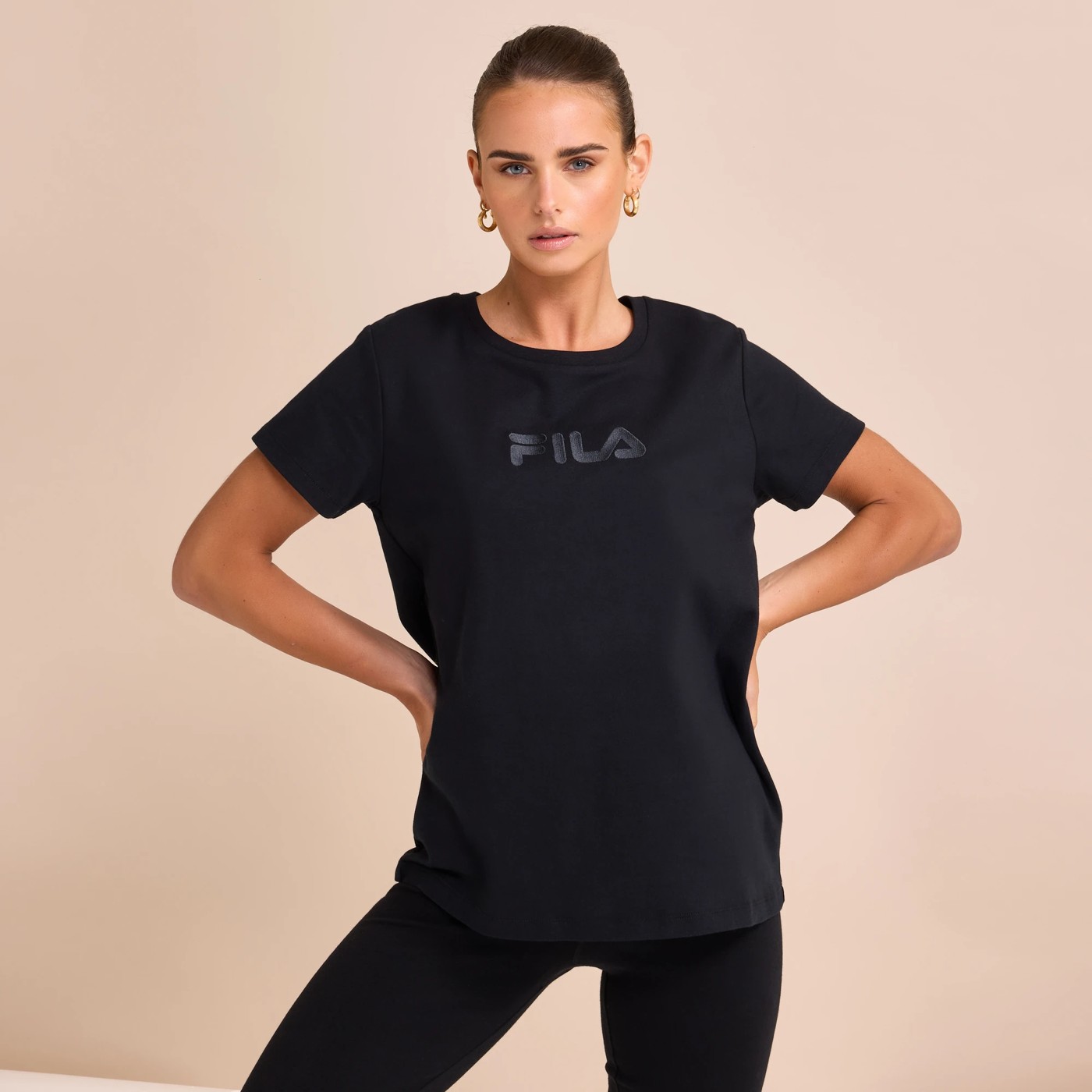 A part of the FILA core range. This women's 100% cotton tee will be a part of your fashion rotation. Featuring a flattering silhouette, short sleeves and embroidered FILA logo at centre chest and back hem.