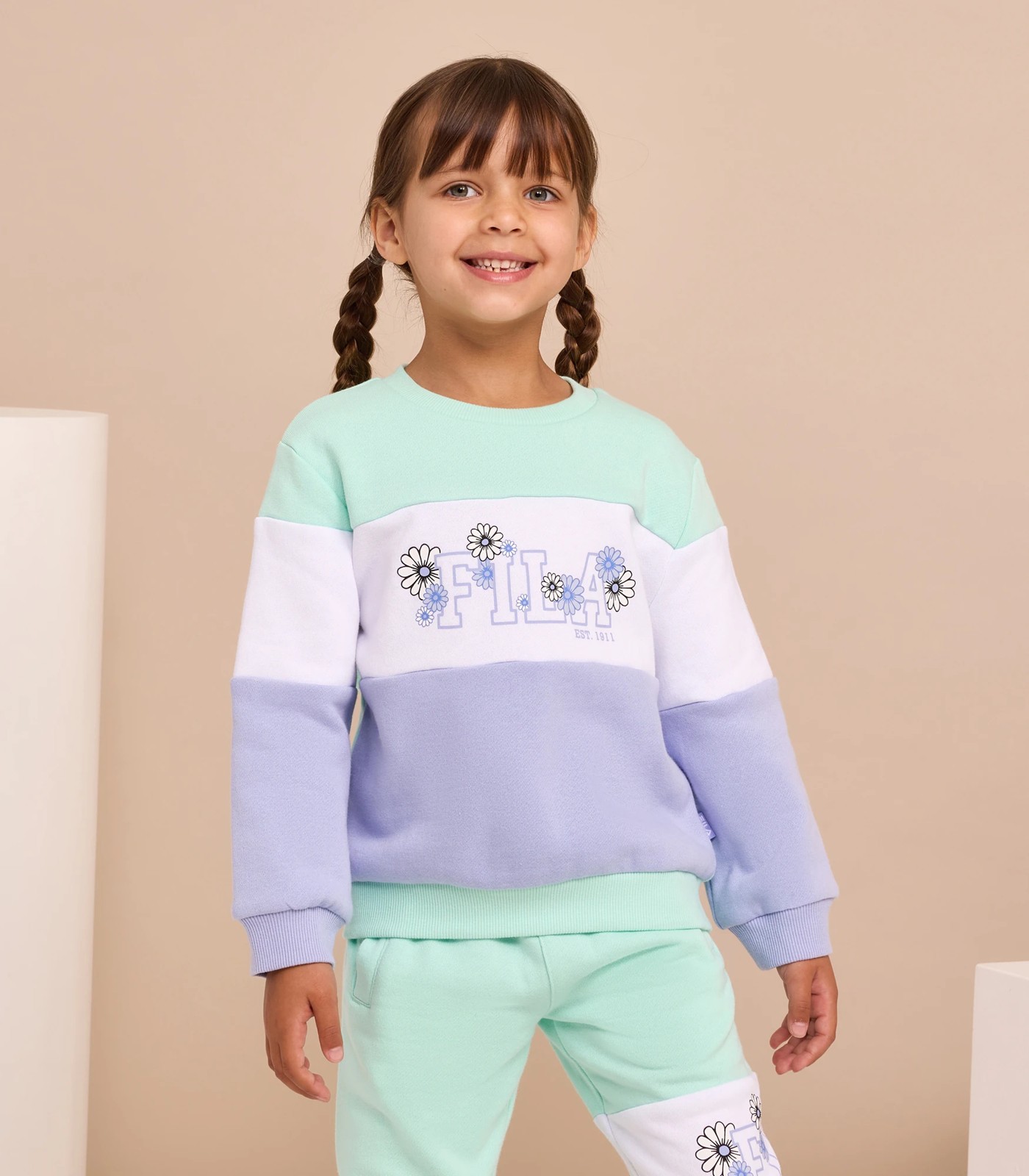 Discover the perfect blend of style and comfort with the Fila Crew Jumper - Emme. Made from cotton and polyester brushed fleece, this jumper ensures your little girl stays cosy and warm. The striking contrast splicing on the chest and sleeves adds a sporty touch, while the iconic Fila print on the front makes a bold statement. It features a ribbed neck, cuffs and hem for a snug fit. The Fila tag on the side seam and the elastic back neck tape add the finishing touches. Upgrade your child's wardrobe with this must-have jumper - she’ll love it, and so will you!