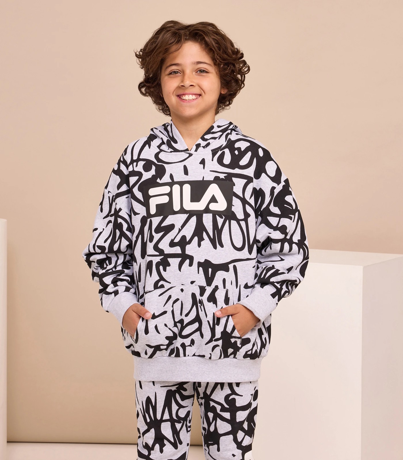 Introducing the Fila Oversized Graffiti Popover Jumper - Jordie. Made from a luxurious blend of Cotton and Polyester brushed fleece, this hoody is designed to keep you warm during the winter weather. The standout feature of this hoody is the unique graffiti all over print, making a bold fashion statement. It also comes with a front kanga pocket and a fully lined hood for added functionality. The large Fila print on the chest and the ribbed cuffs and hem provide extra comfort. Complete the look with the Jordie trackpant (sold separately) for a matching set. Upgrade your wardrobe today with the Fila Oversized Graffiti Popover Jumper - Jordie.