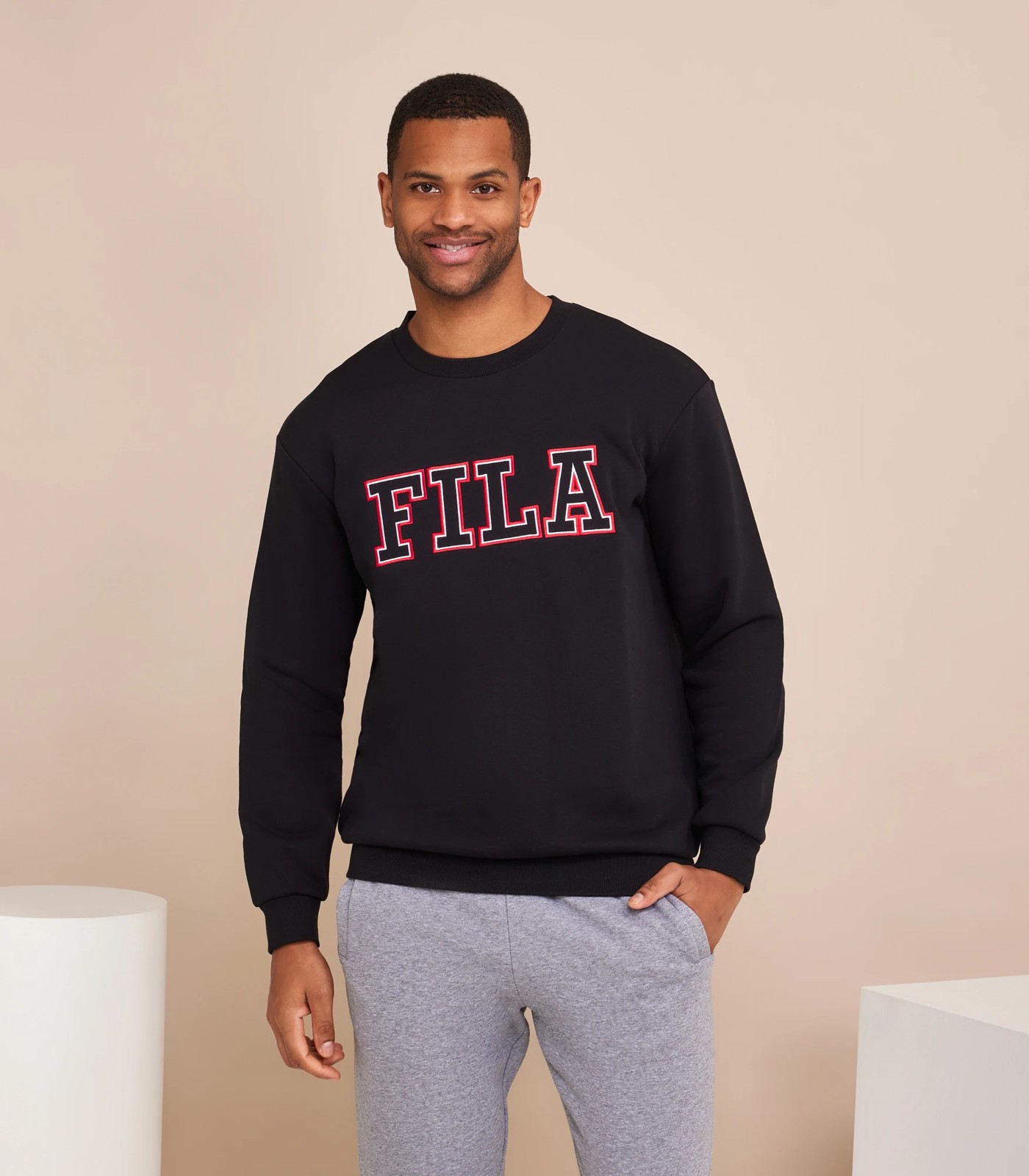 Take it back to basics and update your off-duty essentials with this men's Harry Crew from Fila. In a black colourway, this oversized fit crew is made from a Cotton/Poly brushed fleece for maximum comfort. Featuring a large Fila applique embroidery to centre front chest and a rib to neck, cuff and hem.