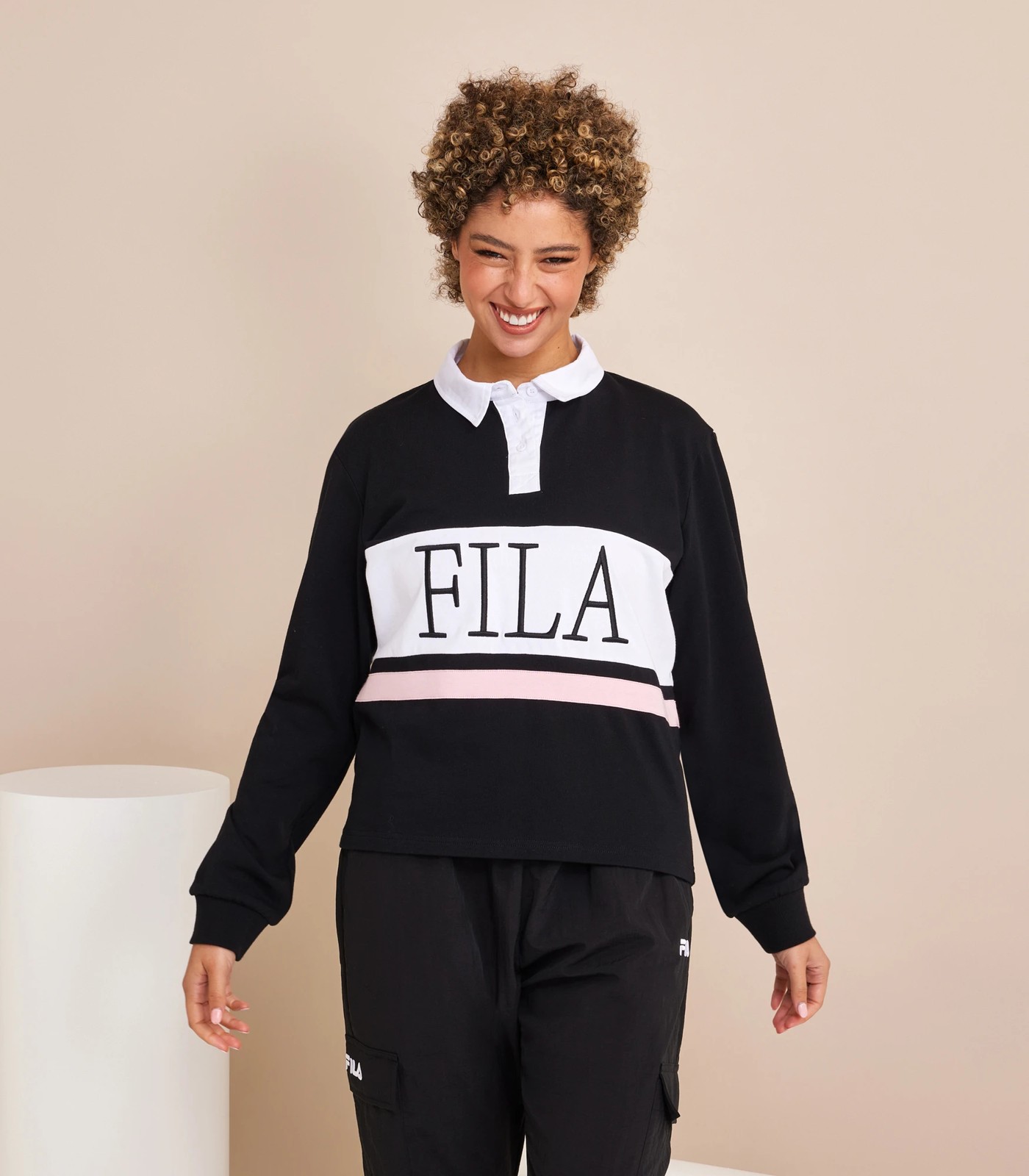 Dress for off-duty days and casual outings this season in our new Kelsey rugby jumper from Fila crafted from soft Cotton. This piece offers both comfort and style, featuring contrast splicing and Fila embroidery to the chest with a contrast collar and placket. This rugby jumper has ribbing to cuffs and Fila elastic back neck tape for extra comfort.