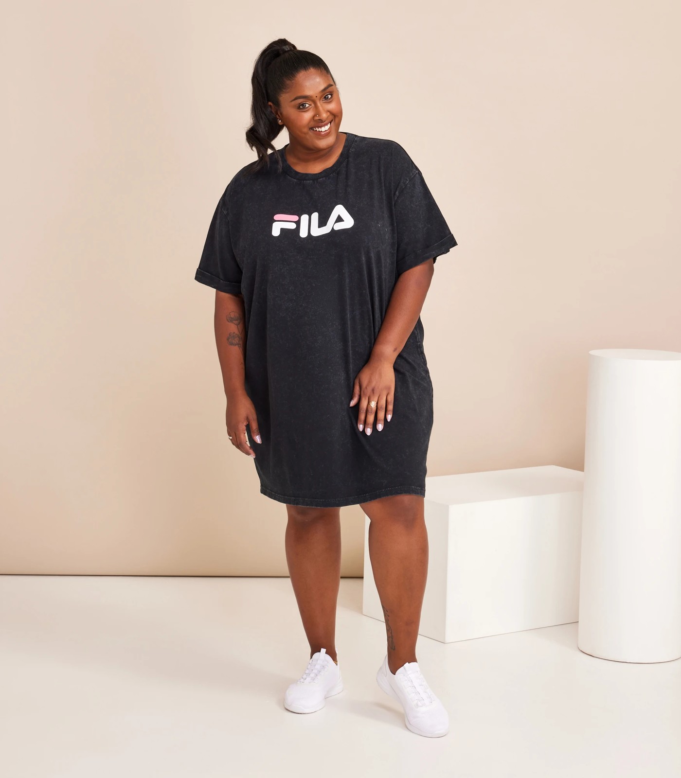 Your new tshirt/dress in one, the Remi dress is a must have comfy style for your wardrobe. The Remi dress can be dressed up or down, can be paired with your fave sneakers for an effortless look. Made from a Cotton acid wash, features extended sleeves, turned back cuffs and a FILA print to centre front chest.