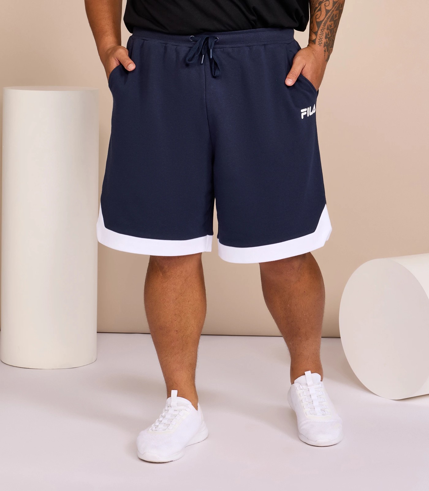 Experience the ultimate laidback comfort with our Men's Fila Plus size Kingston Shorts. Crafted from a soft and slightly brushed cotton/polyester French Terry material, these shorts offer a boost of luxury and relaxation. The standard-fit design ensures a comfortable and relaxed feel. The ribbed waistband with a drawcord allows for a custom fit, so you can enjoy all-day comfort without any restrictions. Step into unparalleled comfort and style with our Fila Plus Kingston Shorts!
