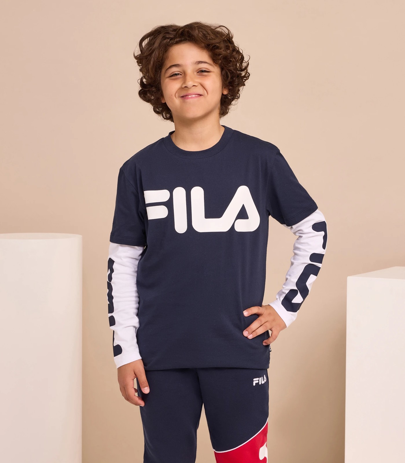Discover a perfect blend of comfort and style with this boy's cotton long sleeve tee. Featuring a striking large Fila print on the chest and sleeves, this t-shirt is designed to make a statement. The contrast sleeves add a stylish touch, while the ribbed neck and Fila elastic tape provide extra comfort. Ideal for everyday wear or active adventures, this shirt is a versatile addition to any wardrobe. Don't miss your chance to own this stylish and comfy piece – order yours today!
