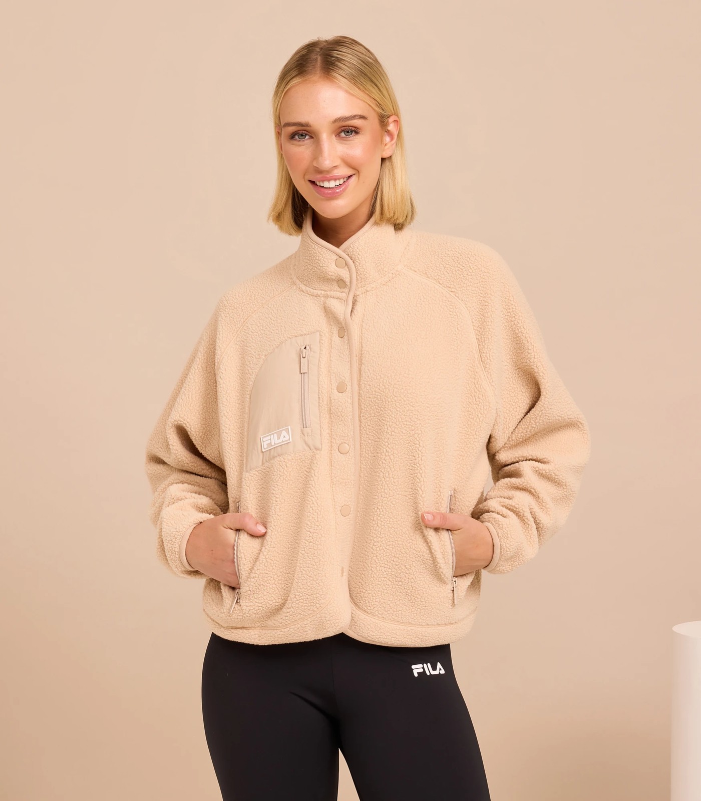 Introducing the Women's Meeya Teddy Jacket from Fila. This cosy jacket is designed to keep you warm and snug, while its relaxed fit allows for easy layering. Whether you're running errands or going on a casual adventure, this jacket is a must-have addition to your wardrobe. It features a convenient front pocket with a durable zip and a stylish Fila rubber badge. Upgrade your outerwear collection with the Fila Teddy Jacket and stay both warm and fashionable!