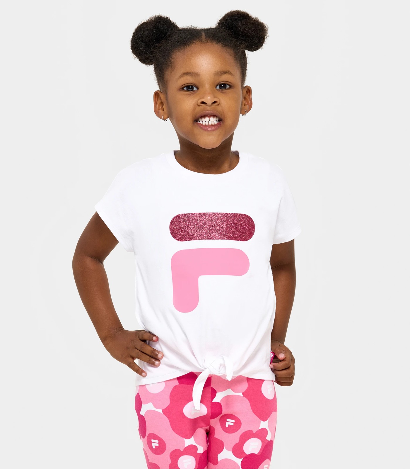 For a basic top they’ll want to wear over and over this season, the Juni tie tee is made from soft Cotton. Versatile enough for everyday wear with a rib neck, large fila print with a glitter 'F' tip to centre front chest. The tie front detail at the centre front hem allows for a customisable and chic look. style this tee with the Juni bikeshorts (sold separately) for a super cute fit.