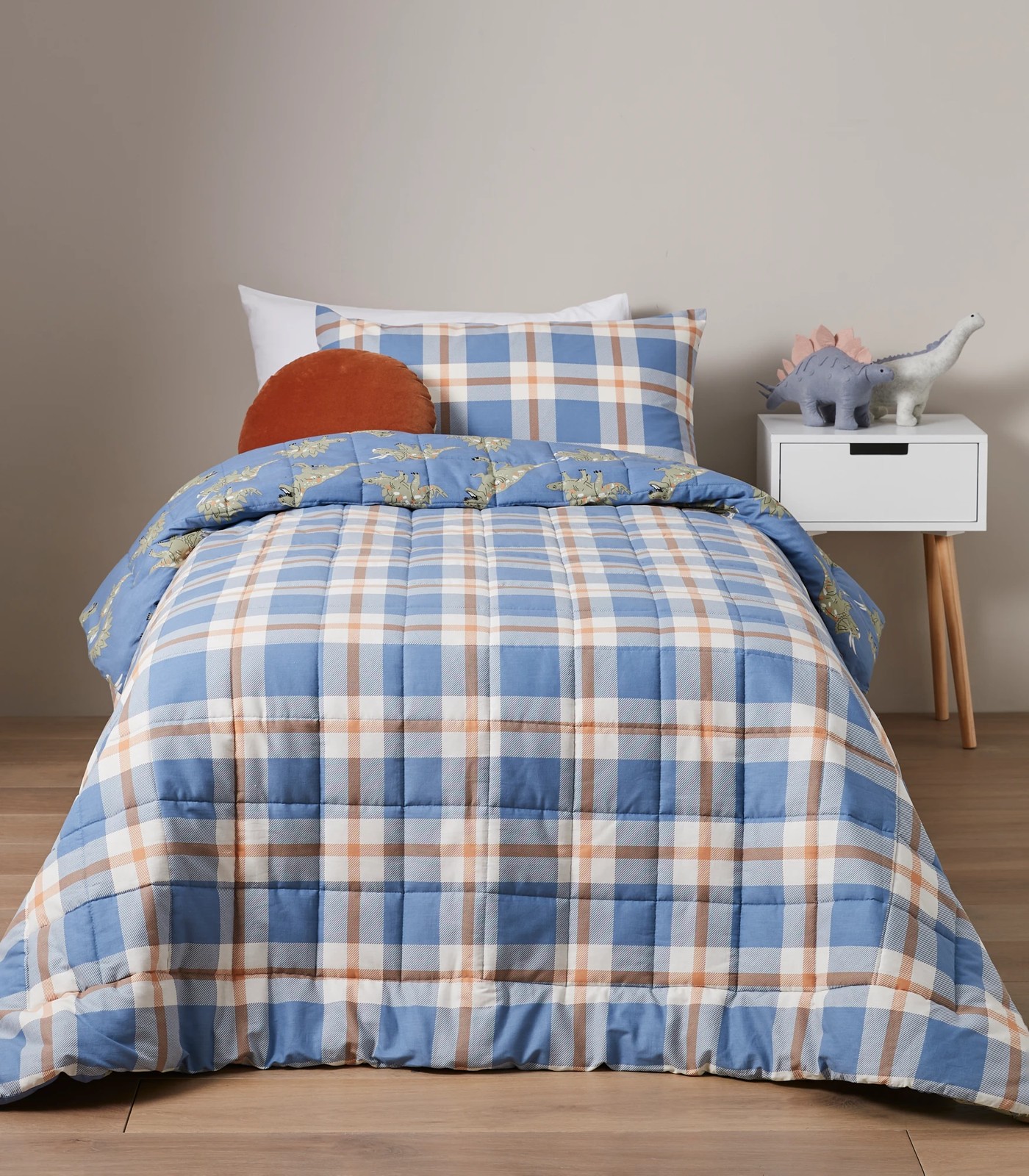 The Finn Check Kids Comforter Set is a fun choice for their bedroom. The set is made from 180 thread count cotton with a warm polyester fill to help keep them cosy all night long. Featuring a colourful blue and orange check design with a dinosaur print on the back, this reversible comforter set is great for a kids room refresh.