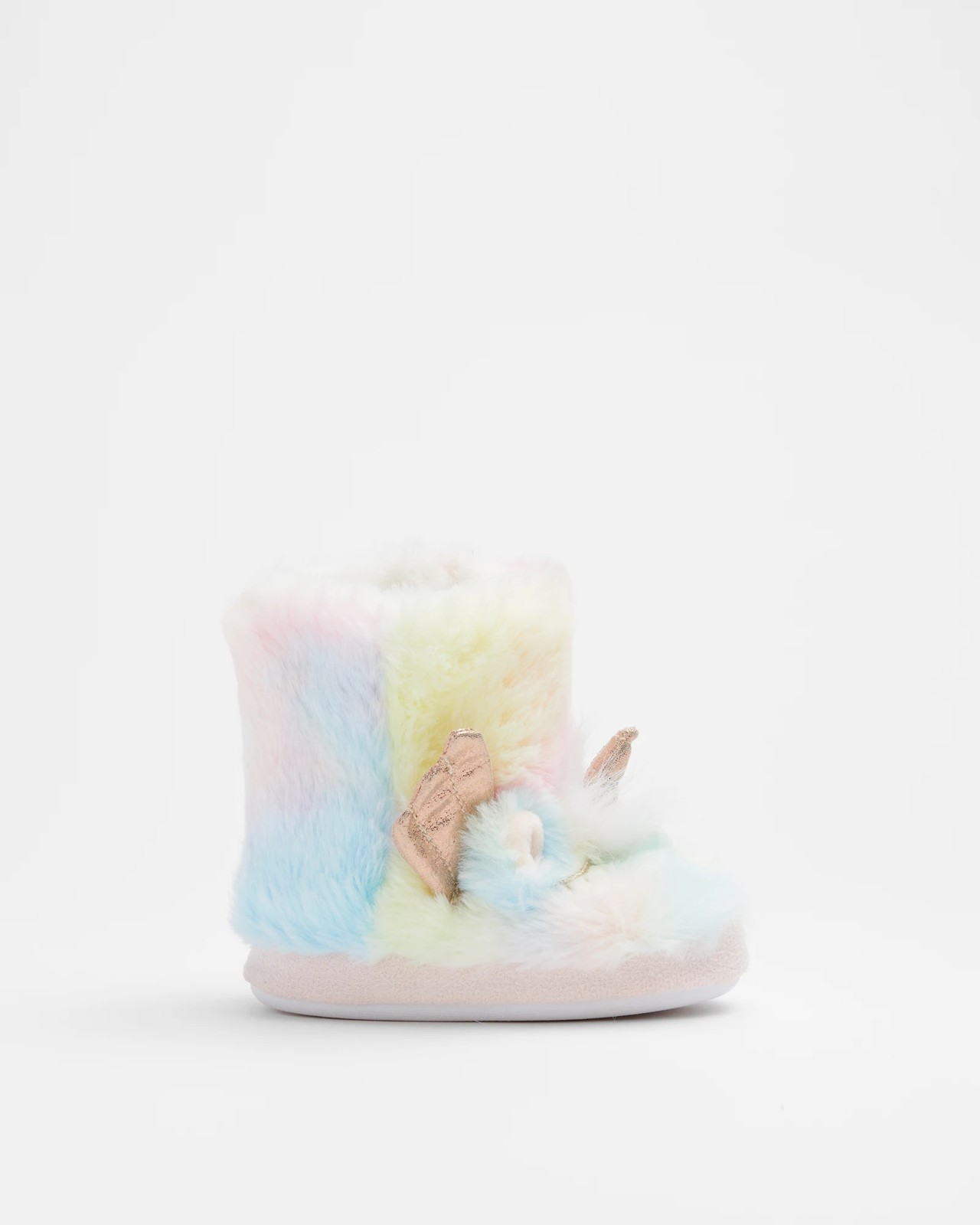 Give your little one their first magical steps with our Baby Girls Unicorn Slipper Boots. These charming booties feature an enchanting design with a soft, faux fur upper in delightful rainbow colours. The adorable unicorn details, including a horn, ears, and wings, will make your child's feet look extra cute and whimsical. With a comfortable padded footbed and a cosy faux fur lining, these slippers ensure every step is cushioned and warm. Order now and let your little one's adventures begin!