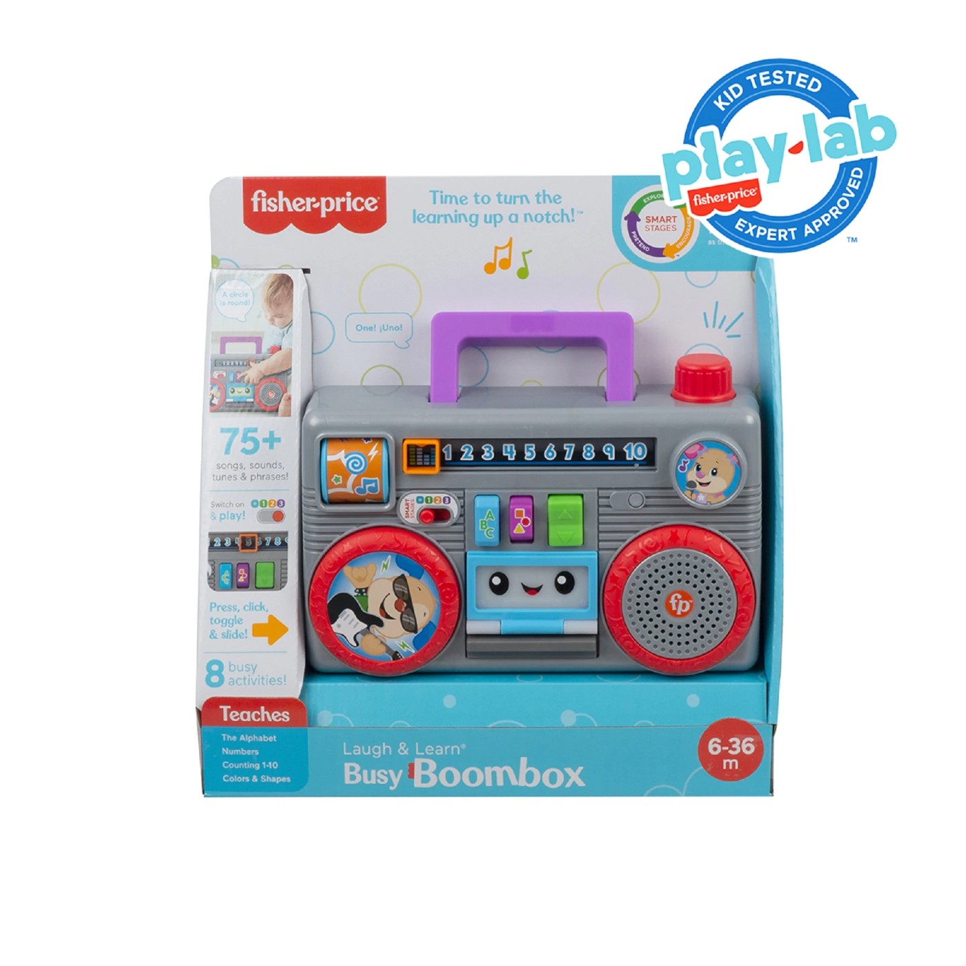 Turn it up, baby. The Laugh & Learn Busy Boombox from Fisher-Price is a pretend stereo loaded with hands-on activities, lights, music and sounds for your mini-me to explore at home or while travelling.