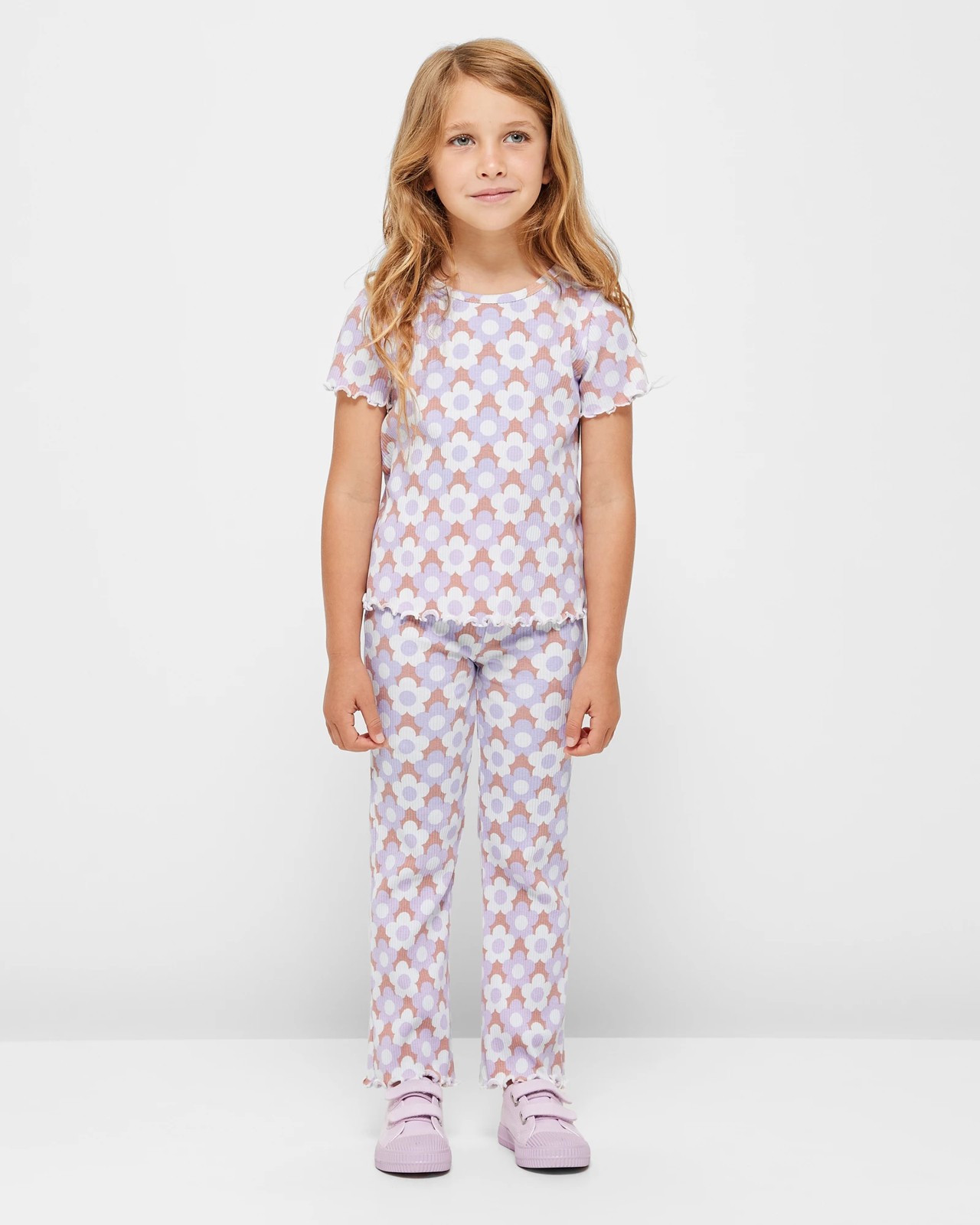 Upgrade your little one's wardrobe with the Floral Flare Cotton 2 Piece Set. Made from soft cotton rib with stretch, this set offers a comfortable and regular fit. The crew neck and short sleeves with lettuce cuffs add a touch of style, while the lettuce hem on the top enhances the overall look. The set features a matching floral print pant with an elastic waistband and flare leg for added flair. Perfect for any occasion, this set is a must-have for your little fashionista. Get the Floral Flare Cotton 2 Piece Set today!