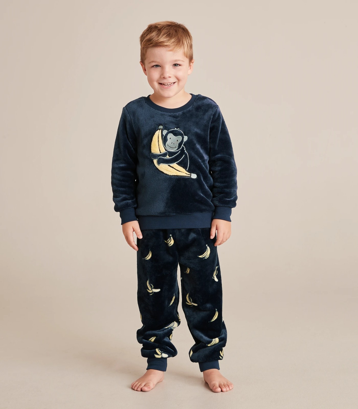 In a great value 2 piece set crafted from cosy and warm fleece comes the navy blue Fleece Monkey Pyjama Set, with a ribbed crew neck, cuffs and hem and matching all over print pants.