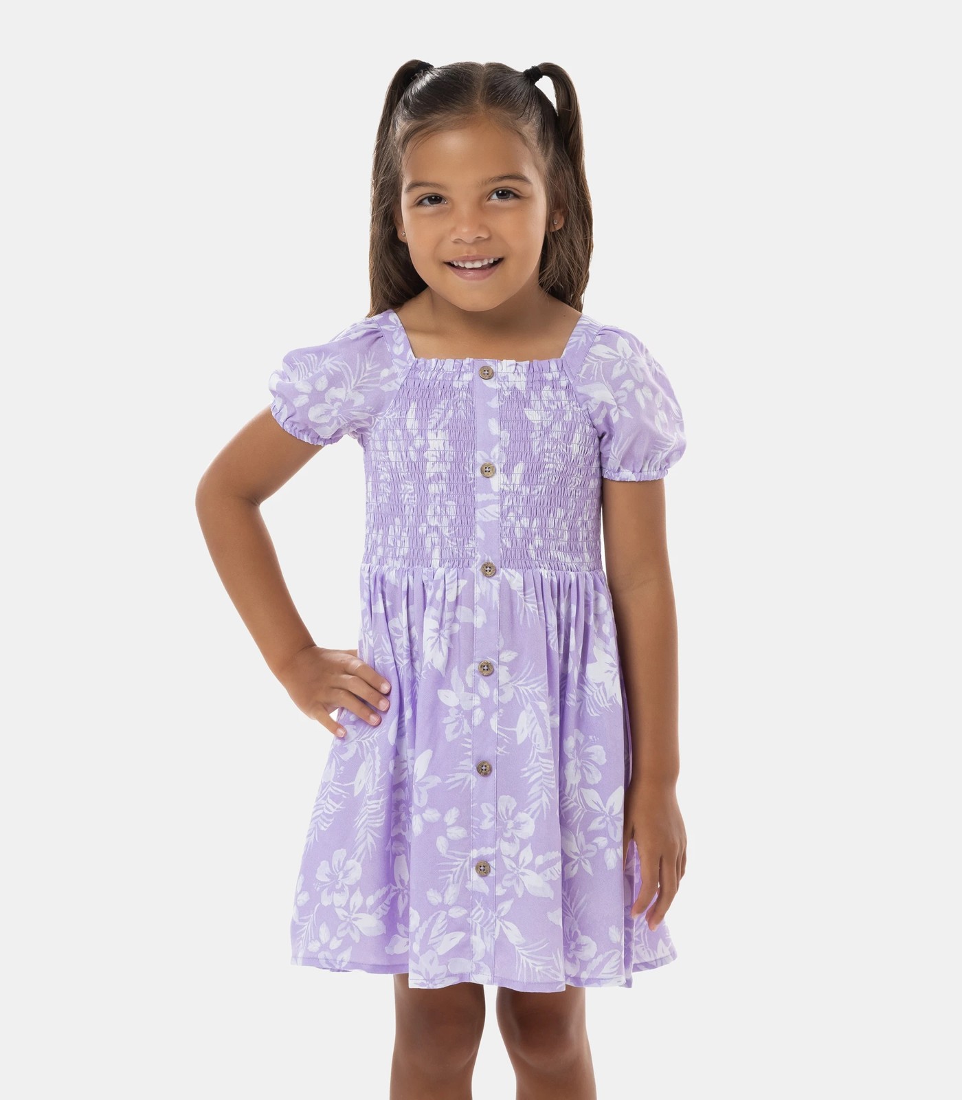 The perfect dress for play featuring the sweetest lilac print, shirred body and button front details.