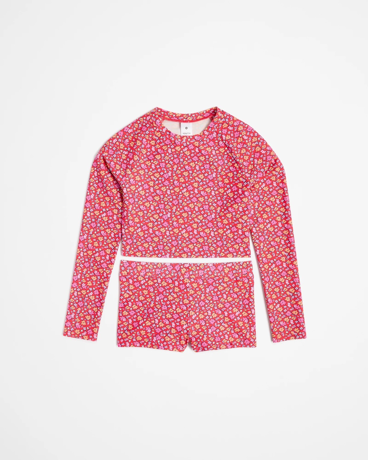 Dive into summer fun with our Floral Swim 2 Piece Set, the perfect blend of comfort and style. This vibrant red floral print set features a stand collar and long raglan sleeves, allowing your child to move freely in the water. The cropped fit top pairs perfectly with matching shorties that stay securely in place thanks to the elastic waistband. Both pieces are lined to ensure a snug and secure fit, making this set an essential for beach and pool days. Make a splash and add this charming swim set to your little one's wardrobe today.