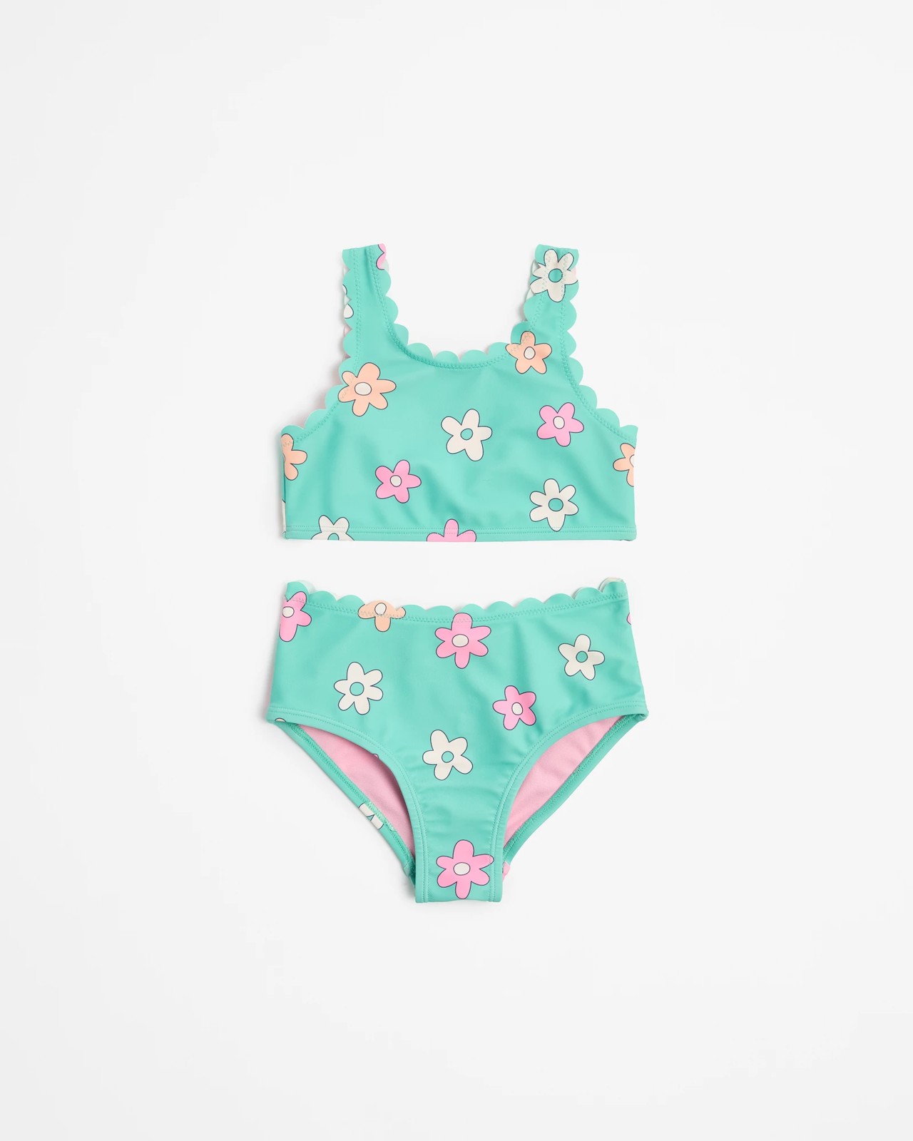 Dive into summer fun with our Floral Swim 2 Piece Set. This charming set features a delightful green floral print that will instantly brighten any poolside adventure. The scalloped shoulder straps and scoop back add a touch of sophistication, while the elastic waistband ensures a comfortable fit. Complete with matching briefs and fully lined for added comfort, this swimsuit is perfect for any sunny day. Let your little one make a splash in style - order yours today!