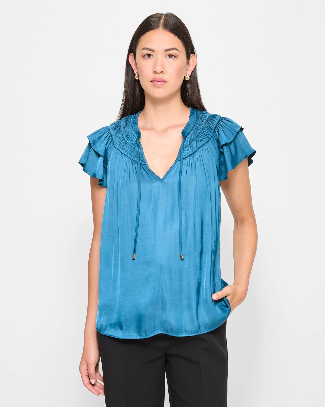 Indulge in style with our Flutter Shirred Blouse by Preview. Created with a gentle touch of elegance, the blouse features a soft and silky texture for a luxurious feel. The charming design includes a round neckline adorned with upper frill and a centre tie-up with a delightful keyhole detail. The shirred panels add a unique touch, perfectly complemented by the flutter sleeves. Elevate your wardrobe with a piece that effortlessly blends comfort and sophistication.