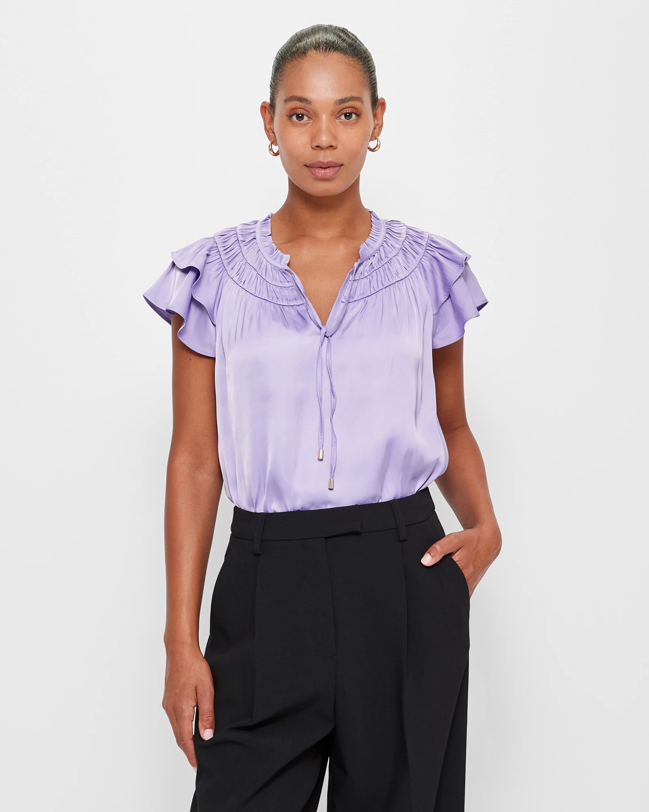 Introducing our beautiful Flutter Sleeve Shirred Blouse from Preview. Made from a luxurious polyester fabrication, this blouse has an all-over satin feel that is sure to elevate your style. The regular fit and crew neckline with upper frill create a sleek and sophisticated look. The centre neckline tie up with front v-drop adds a touch of elegance. The shirred panels around the neckline and shoulders provide a flattering and comfortable fit. The short flutter sleeves add a feminine and whimsical touch. Complete your outfit with this blouse's curved hemline for a polished and trendy look. Upgrade your wardrobe today!