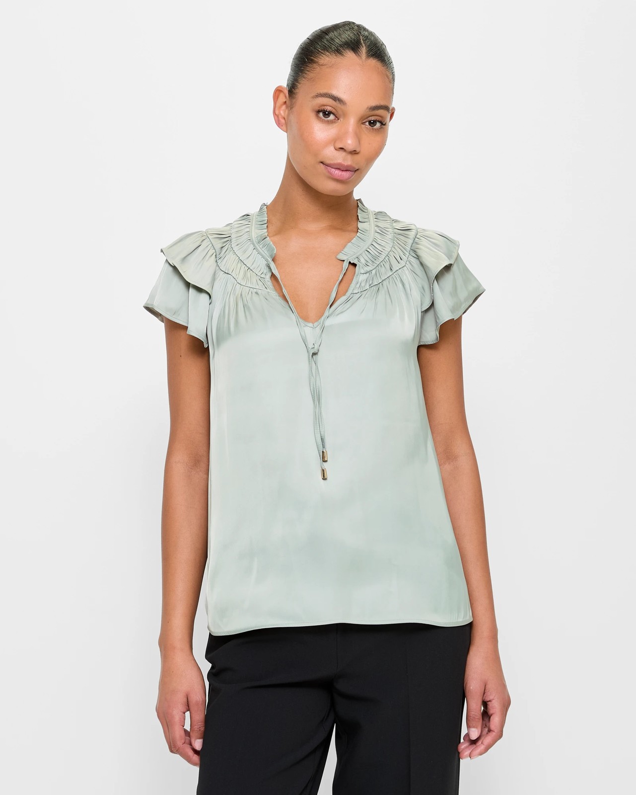 Introducing our beautiful Flutter Sleeve Shirred Blouse from Preview. Made from a luxurious polyester fabrication, this blouse has an all-over satin feel that is sure to elevate your style. The regular fit and crew neckline with upper frill create a sleek and sophisticated look. The centre neckline tie up with front v-drop adds a touch of elegance. The shirred panels around the neckline and shoulders provide a flattering and comfortable fit. The short flutter sleeves add a feminine and whimsical touch. Complete your outfit with this blouse's curved hemline for a polished and trendy look. Upgrade your wardrobe today!