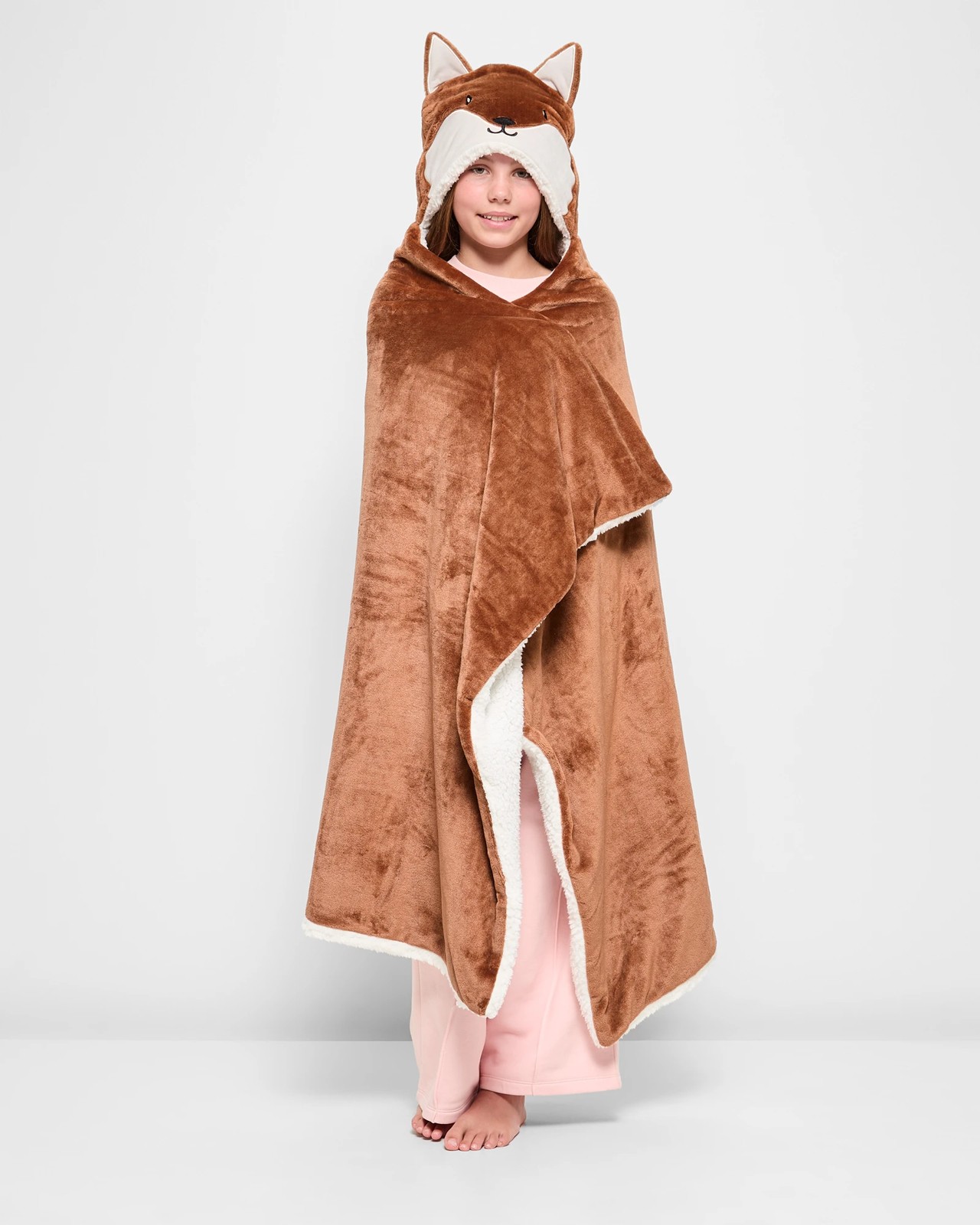 Ensure your child stays warm and happy with the Fox Kids Hooded Throw. Ideal for both playtime and relaxation, this throw features an endearing fox hood, showcasing intricate applique details, an embroidered face, and playful 3D ears. Constructed from super-soft velvet polyester and lined with plush sherpa, it guarantees exceptional comfort and warmth. The rich brown colour complements any kids' decor seamlessly. Practical and easy to care for, the throw is machine washable. Measuring 150cm by 110cm, it is perfectly sized to keep your little one snug. Turn everyday moments into cosy adventures with this charming hooded throw!
