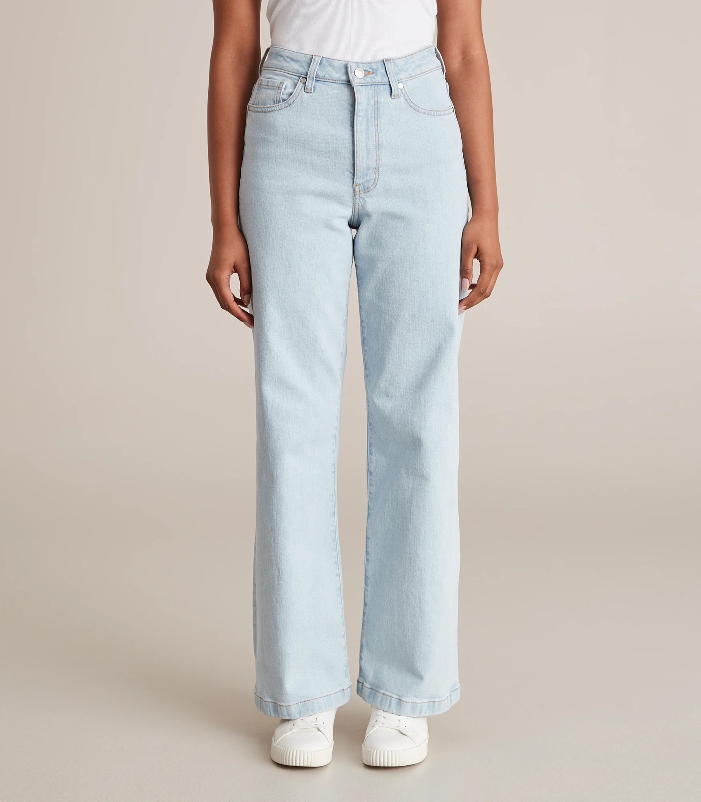The Frankie wide leg high rise full length denim jeans features a high rise waist, a wide leg and a cotton rich fabrication for comfort and breathability.