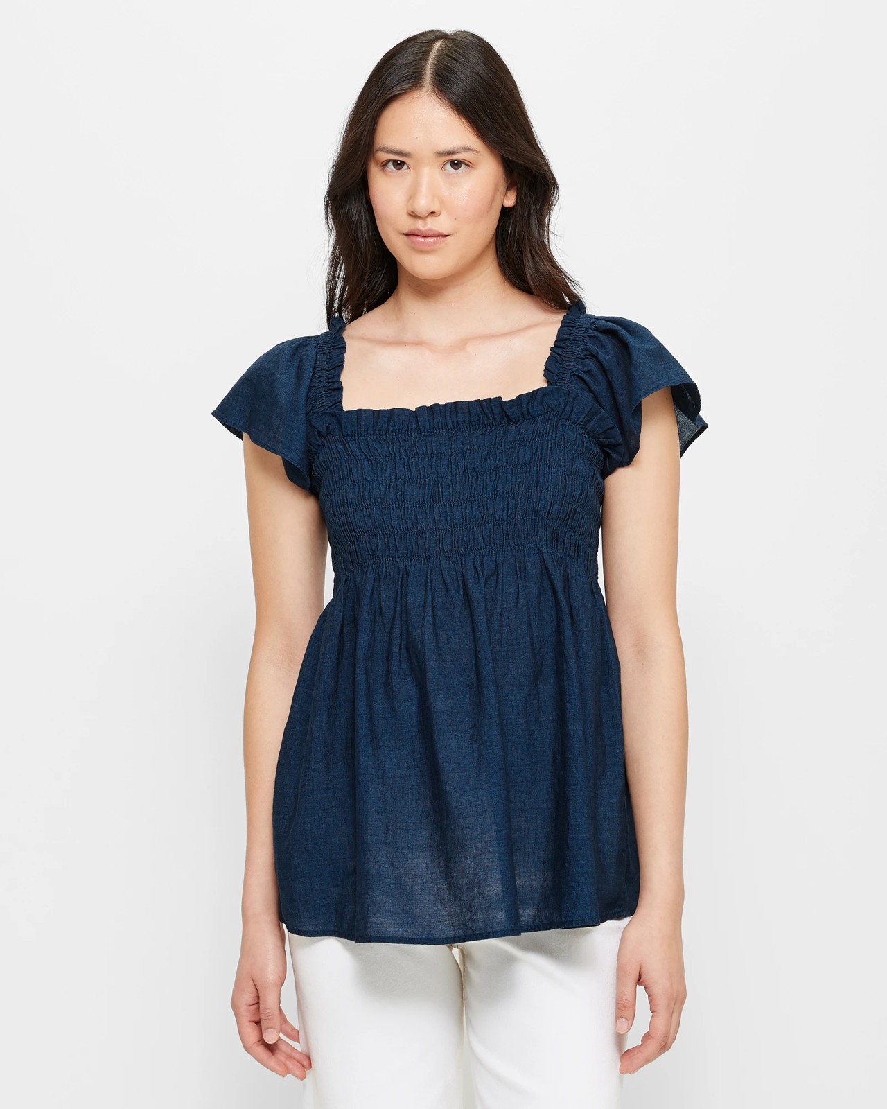 The Frill Shirred Top is a must-have addition to your wardrobe. Made from a lightweight cotton fabrication, this top offers a regular fit and is perfect for those warmer days. The dark denim colour adds a touch of sophistication, while the square neckline and sleeveless design create a stylish look. The elastic around the shoulders ensures a comfortable and secure fit, while the frill around the shoulders adds a feminine touch. The shirred bodice with upper frill accentuates your figure beautifully. Complete the look with a pair of jeans or shorts for a chic and trendy outfit. Upgrade your style with the Frill Shirred Top now!