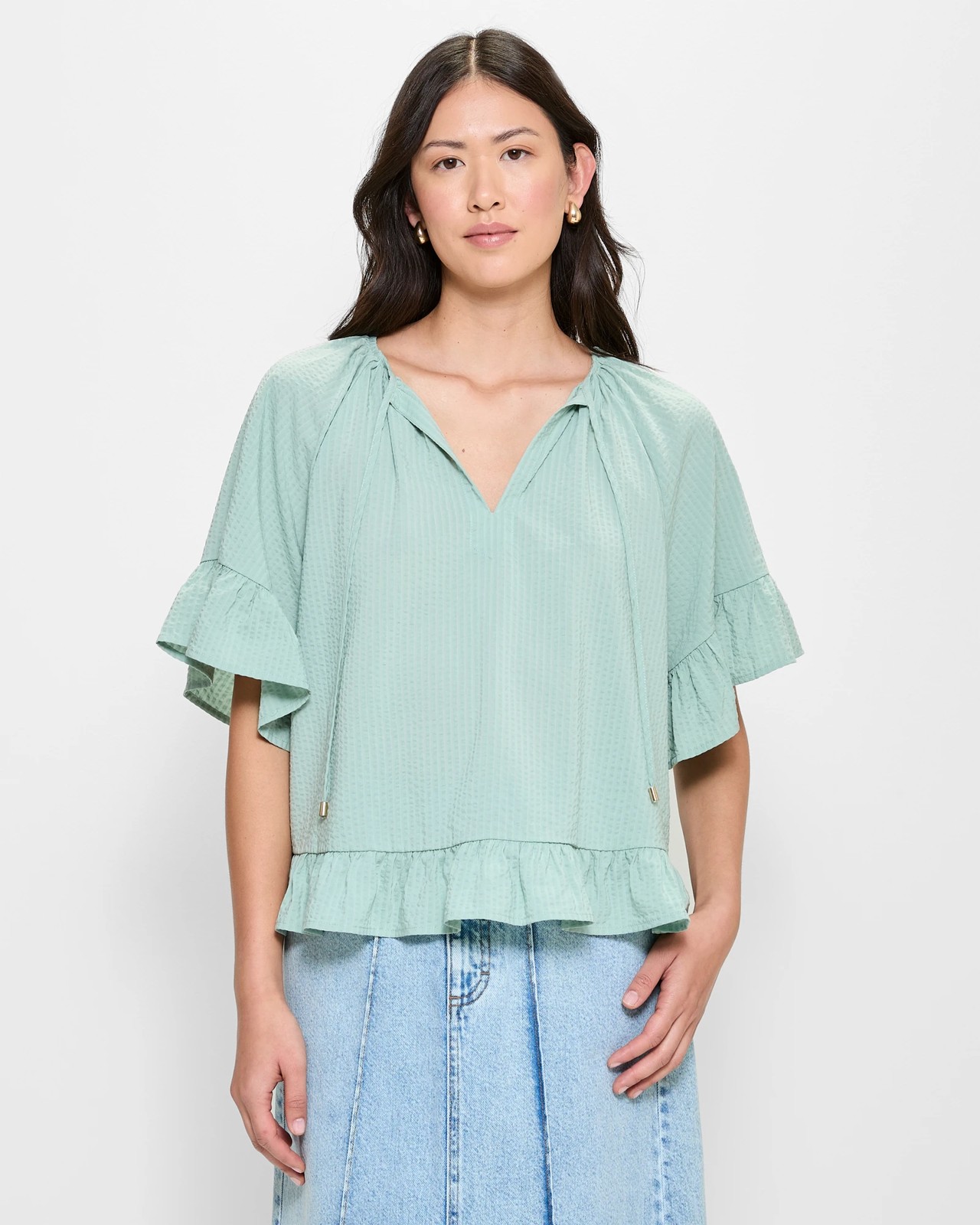 Refresh your wardrobe with our Frill Sleeve Peasant Top, made from a soft viscose and cotton blend to keep you cool and comfortable. This lightweight top boasts a charming textured fabric and a relaxed fit, ideal for both casual outings and weekend gatherings. Featuring a classic peasant design, it includes a delightful gathered crew neckline with a centre tie and keyhole detail, along with flutter sleeves finished with a frilled hem. The curved hemline with frill adds a playful touch. Don't miss the chance to bring a touch of effortless style to your collection.