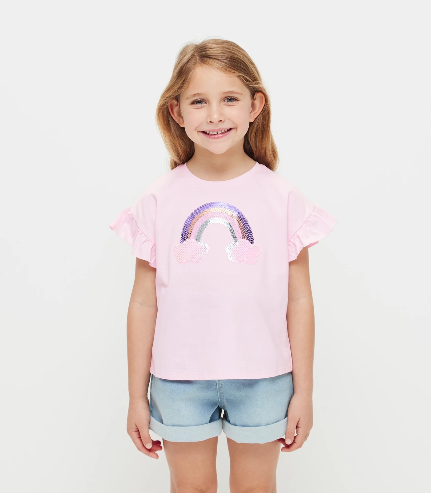 This stylish T-shirt is sure to turn heads. Crafted from a cotton-rich blend, it has a regular fit with a crew neck and short sleeves with frilled cuffs. For added glamour, it boasts sequin applique to the chest and a straight hem for a flattering finish. Perfect for day or night, this T-shirt will make an eye-catching addition to any girl's wardrobe.