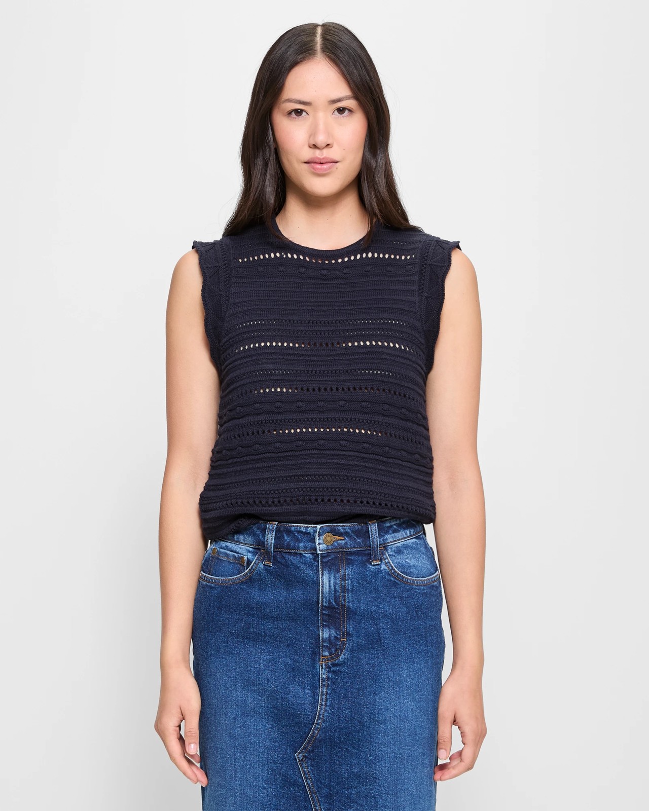 Enjoy the perfect mix of comfort and fashion with our Frill Sleeve Textured Knit Tank Top. Designed from a soft cotton material, this tank top ensures you stay cosy while looking chic. The playful frilled armholes and distinctive textured stripes add character to your outfit. With its classic crew neckline and regular fit, you'll exude confidence and style in any setting. Make this adaptable piece a staple in your wardrobe and revel in its limitless styling options.