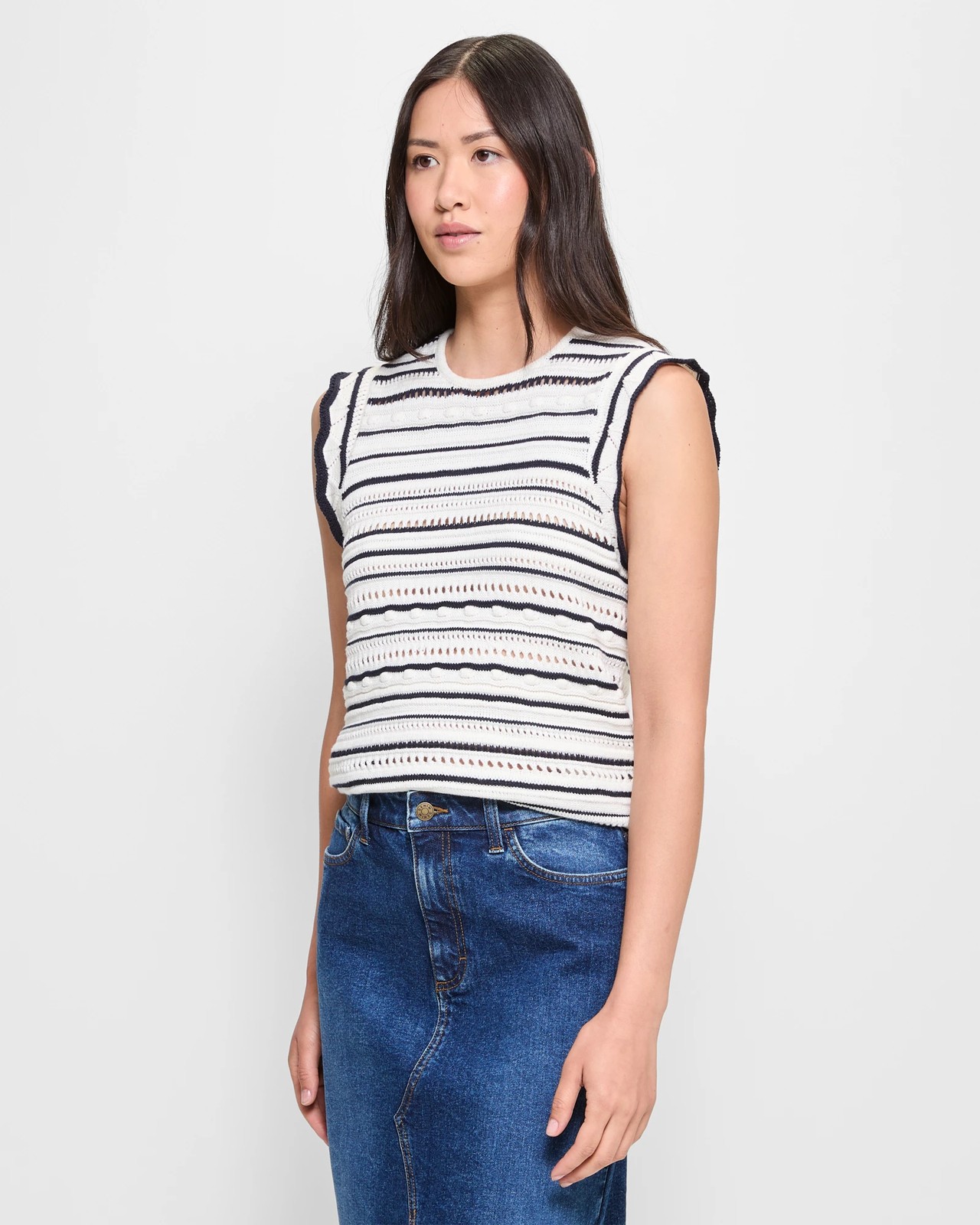 Enjoy the perfect mix of comfort and fashion with our Frill Sleeve Textured Knit Tank Top. Designed from a soft cotton material, this tank top ensures you stay cosy while looking chic. The striking cream and navy stripes offer a sophisticated touch, making it suitable for both casual days out and more formal occasions. The playful frilled armholes and distinctive textured stripes add character to your outfit. With its classic crew neckline and regular fit, you'll exude confidence and style in any setting. Make this adaptable piece a staple in your wardrobe and revel in its limitless styling options.
