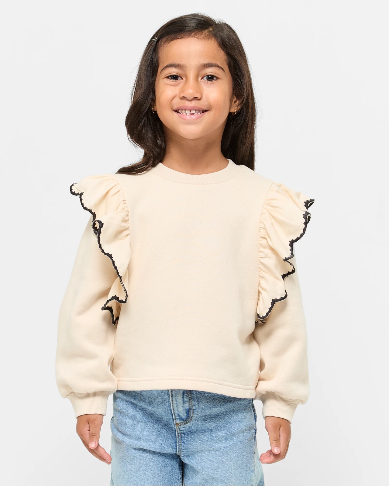 Ease your little one into cosy comfort with our Frill Sweat Jumper. Perfect for any casual outing, this jumper combines a soft cotton poly blend with a stylish frill shoulder trim, ensuring she looks adorable while feeling warm. It features a ribbed crew neck and long sleeves with ribbed cuffs for added snugness. The fleece lining promises extra softness, making it an ideal choice for cooler days. Upgrade her wardrobe with this charming and versatile jumper that she’ll love to wear again and again.
