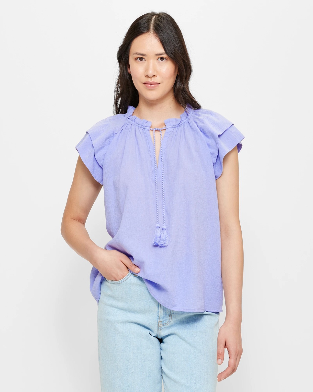 Introducing our Frill Tie Neck Top, a stylish addition to any wardrobe. Made from a smooth and comfortable cotton fabrication, this top features an all-over textured material that adds a touch of sophistication to your look. The regular fit ensures a flattering silhouette, while the lavender colour adds a feminine charm. The round neckline is embellished with an upper frill, giving it a unique and eye-catching detail. The twisted rope tie at the centre front with a v-drop adds a touch of elegance. With its sleeveless design and double frill around the arm holes, this top is perfect for warm weather or layering under a blazer for a more polished look. Complete your outfit with a pair of jeans or trousers for a versatile and trendy ensemble. Upgrade your style with our Frill Tie Neck Top today!