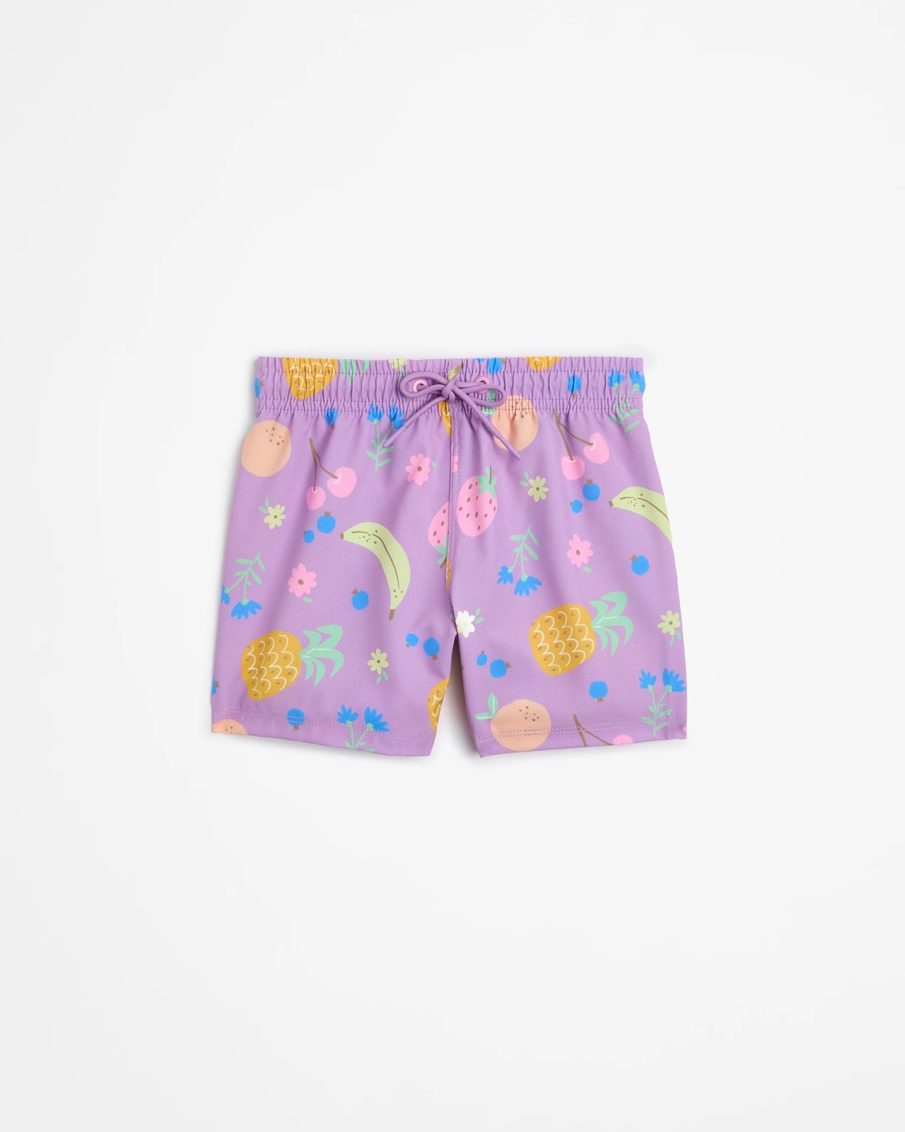 Dive into fun with our girls' swim boardshorts, perfect for making a splash this summer. These vibrant purple shorts, adorned with a playful fruit print, will have your little one standing out by the pool or at the beach. Featuring an elastic waistband with a drawcord, they ensure a snug fit while allowing for easy movement. Their short length is ideal for active beach games or swimming. Don't miss out – grab a pair today and let the adventures begin!