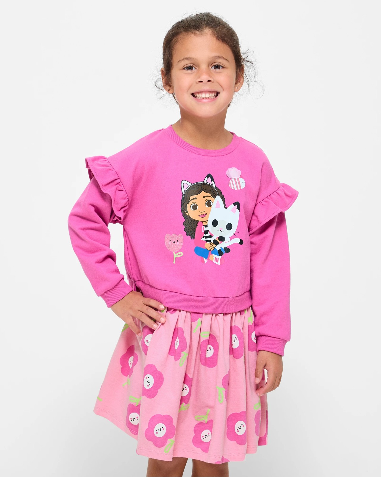 Step into the world of Gabby's Dollhouse with the charming and versatile Gabby's Dollhouse Jumper Dress. Featuring a delightful blend of cotton fabric in a pretty pink shade, the dress offers a regular pull-on fit for ease and comfort. The ribbed crew neck and frill shoulder details add a touch of sweetness, while the large Gabby's Dollhouse print on the front is sure to make a statement. With a ribbed jumper hem and attached skirt, as well as the all-over print bottom, she'll feel like part of the Dollhouse magic.