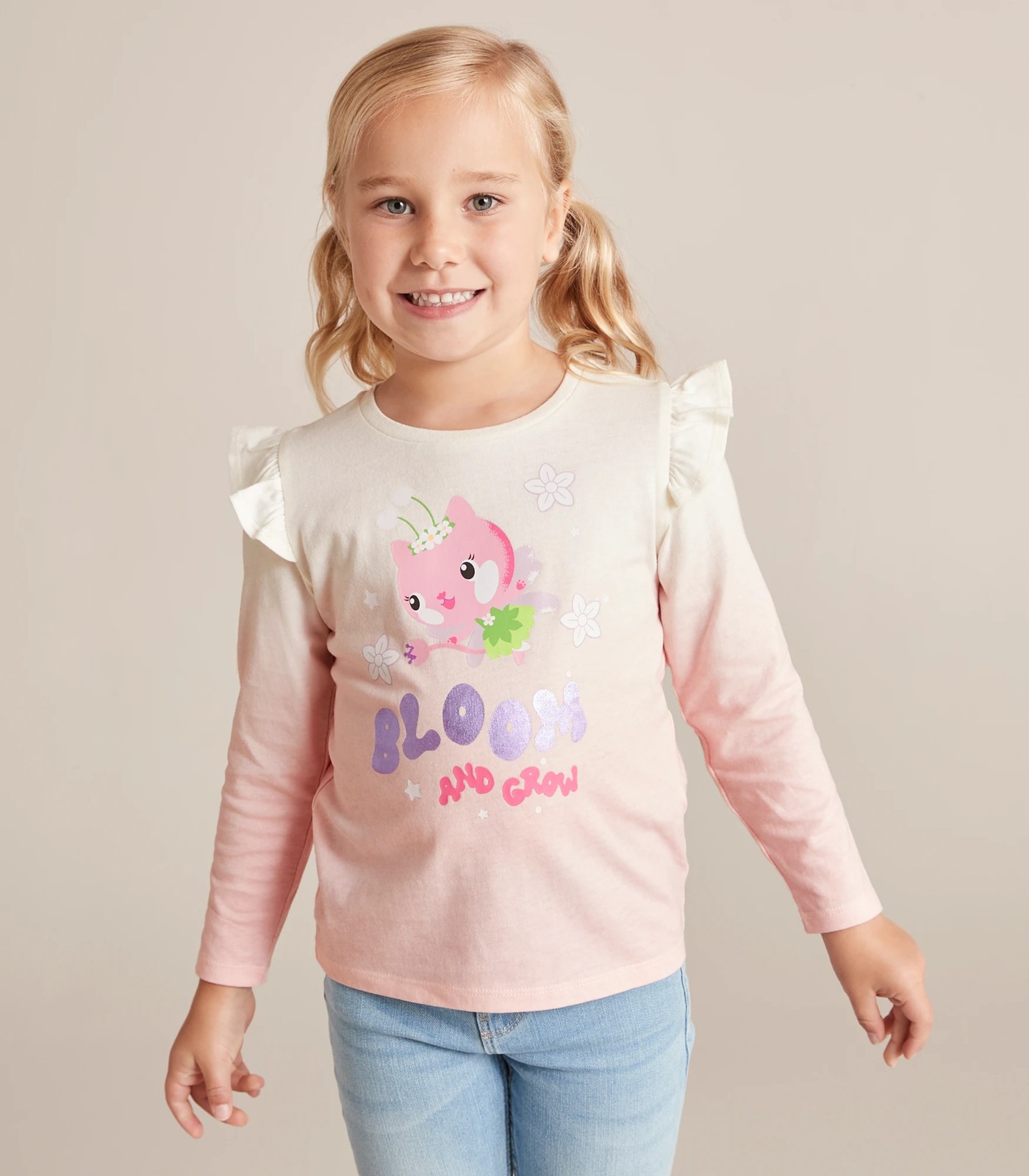 Featuring long sleeves with frill shoulder trim, large print to chest and an ombre print design comes the Gabbys Dollhouse Top.