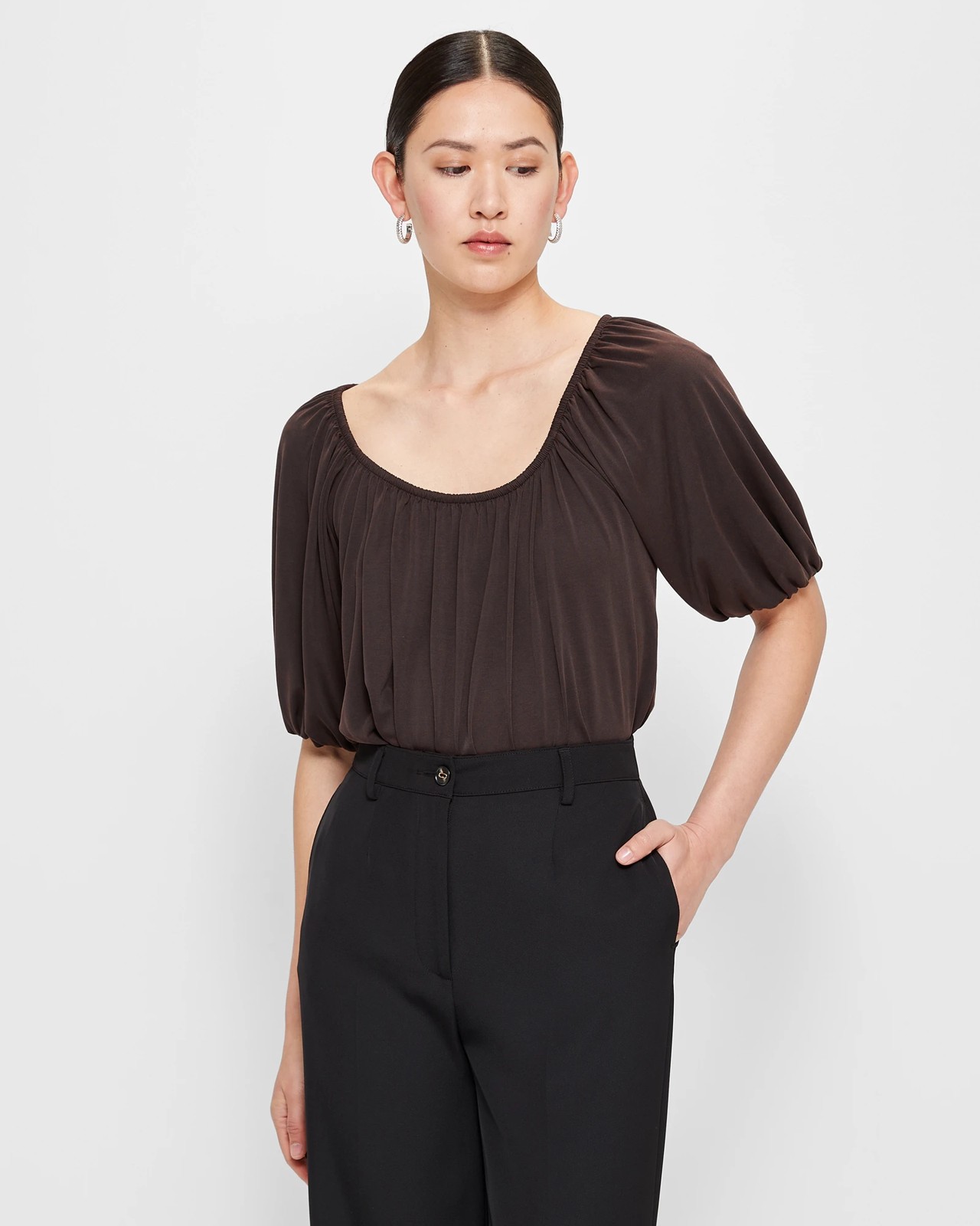 A great everyday piece with a feminine flowing movement, the Preview gathered tee will be a must have for your wardrobe. It features a rounded elastic neckline, short balloon sleeves and a feminine soft modal rich fabrication.