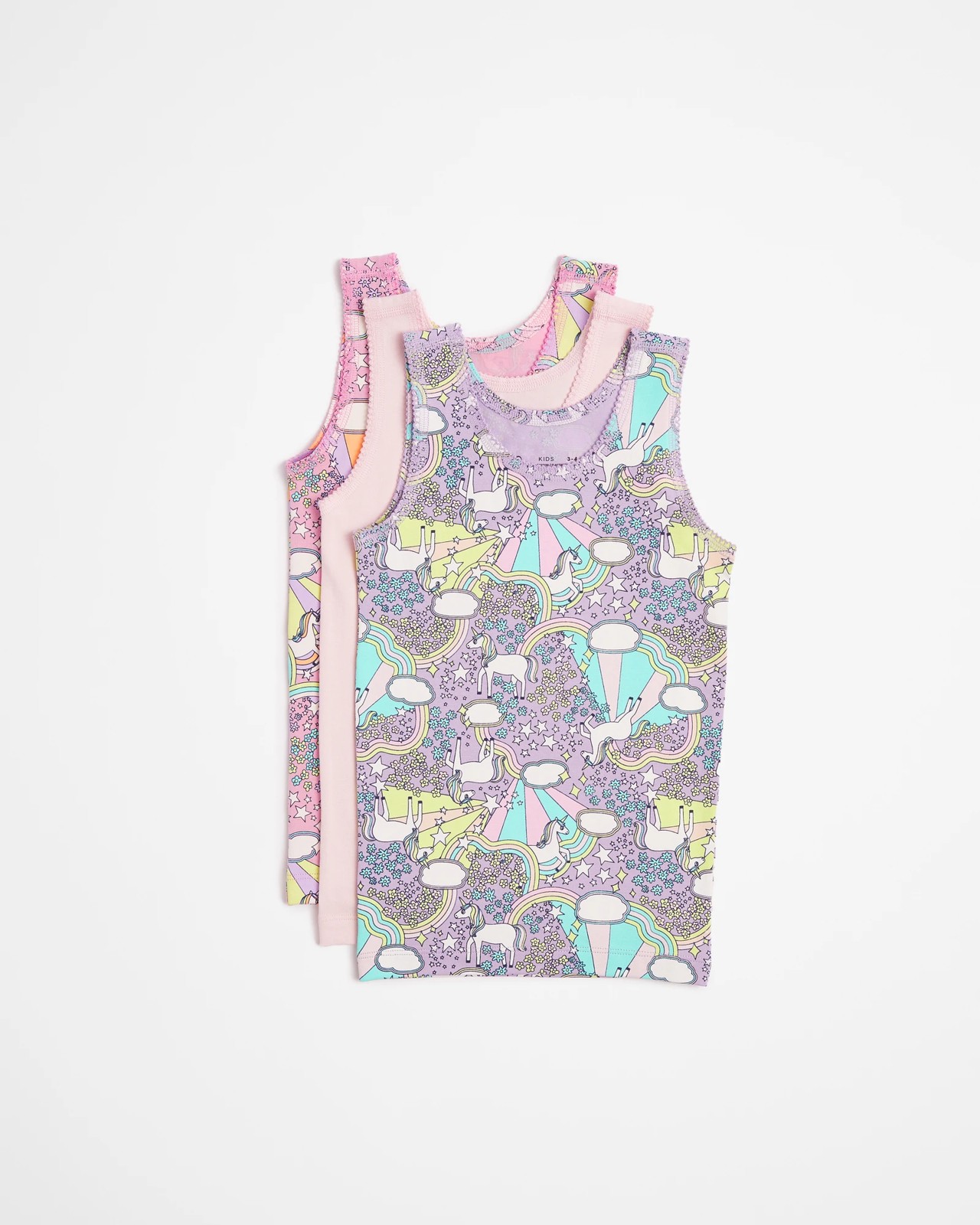 Delight your little one with our charming Girls Cotton Unicorn Vests in a handy pack-of-three. Beautiful cotton blended with a touch-of-stretch, these vests ensure all-day comfort and a perfect fit. Each vest boasts enchanting unicorn prints in lovely shades-of-pink and purple, ideal for sparking your child's imagination. With a classic round neck, sleeveless design, and sweet scalloped trims, these vests are perfect for layering or wearing alone. Make your purchase today and add a touch of magic to your child's wardrobe.