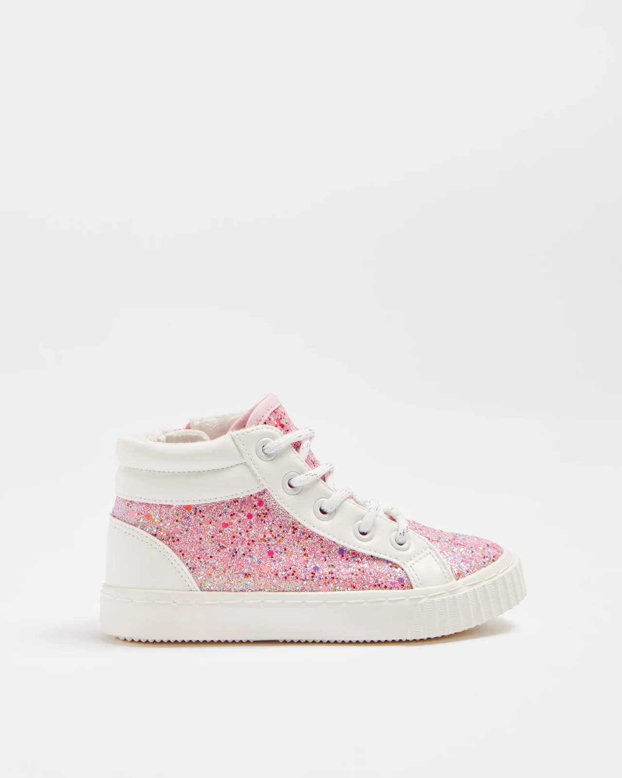 Bring sparkle and joy to every step with these delightful Girls Junior Hi Top Glitter Sneakers. Perfect for all-day wear, they feature a dazzling pink glitter upper that will make her stand out and feel like a star. Easy to put on with a convenient inner zip and secure braided laces, these shoes offer both style and comfort. The padded hi-top collar and footbed ensure a cosy fit, while the flexible synthetic sole provides ease of movement. Treat your little one to these stunning sneakers now!