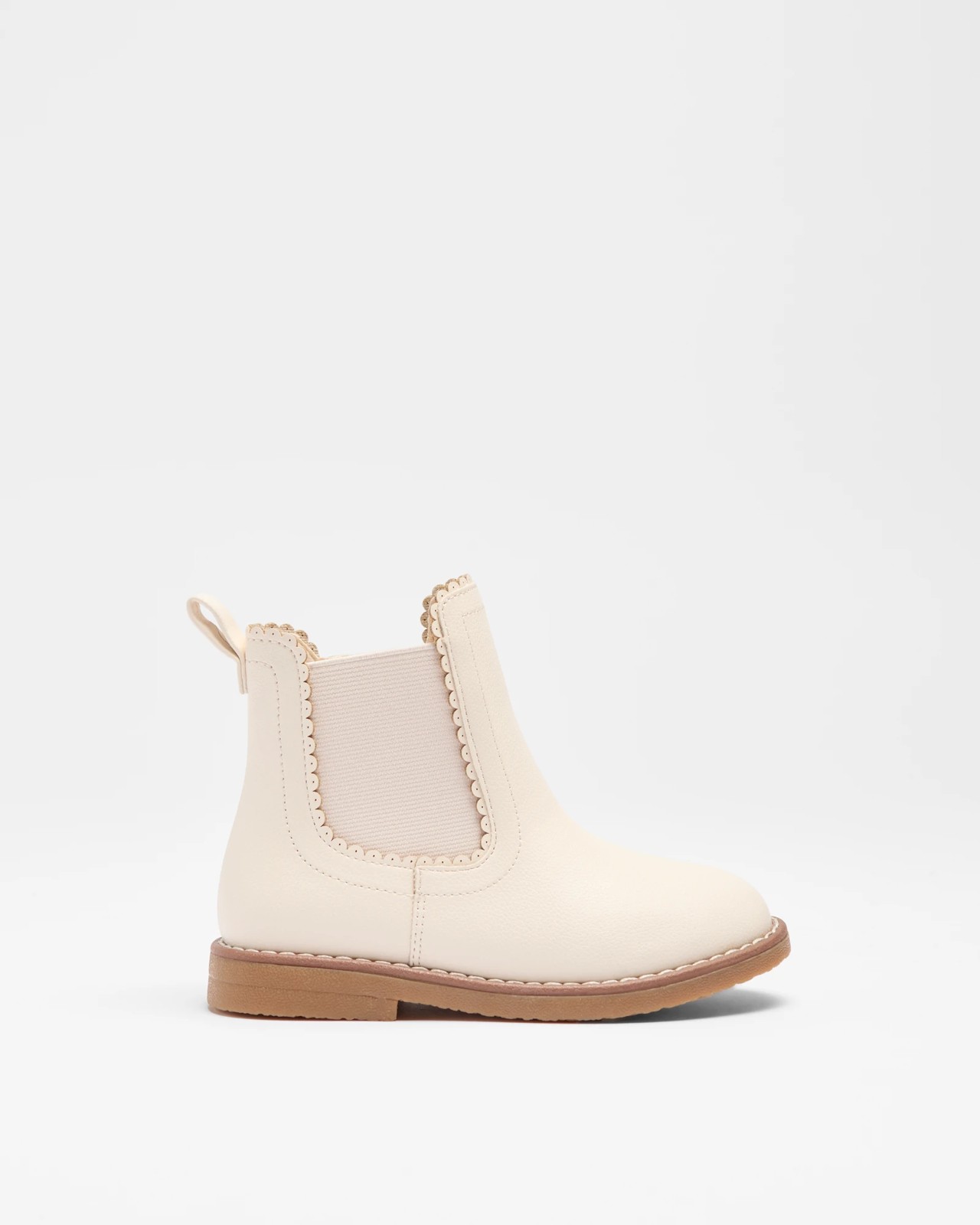 Brighten up your young one's wardrobe with the charming Girls Junior Bambi Scalloped Chelsea Boot. Ideal for any occasion, this boot features a synthetic upper and a closed round toe, ensuring both comfort and resilience. The delightful scalloped edging and practical back pull tab make these boots wonderfully easy to slip on and off. With a secure inner zip and padded footbed, her feet will stay cosy all day long. Add these lovely boots to her collection today and watch her step out in style.