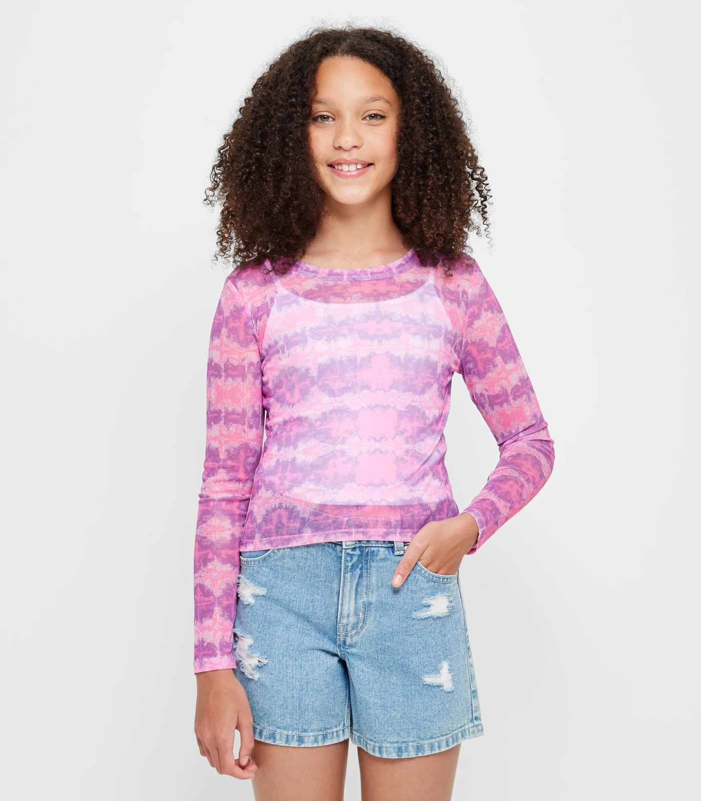 Introducing our Girls Long Sleeve Mesh Top 2 Piece Set, a must-have addition to any fashion-forward wardrobe. Crafted with care from high-quality polyester mesh, this top offers a regular fit that is both comfortable and stylish. Featuring a trendy crew neck and long sleeves, it is perfect for transitioning through seasons. The all-over print adds a touch of personality to any outfit. Plus, it comes with a basic white cotton singlet for added versatility. Whether she's heading to school or a casual outing, this set is sure to make her look effortlessly chic. Upgrade her wardrobe today and let her stand out from the crowd.