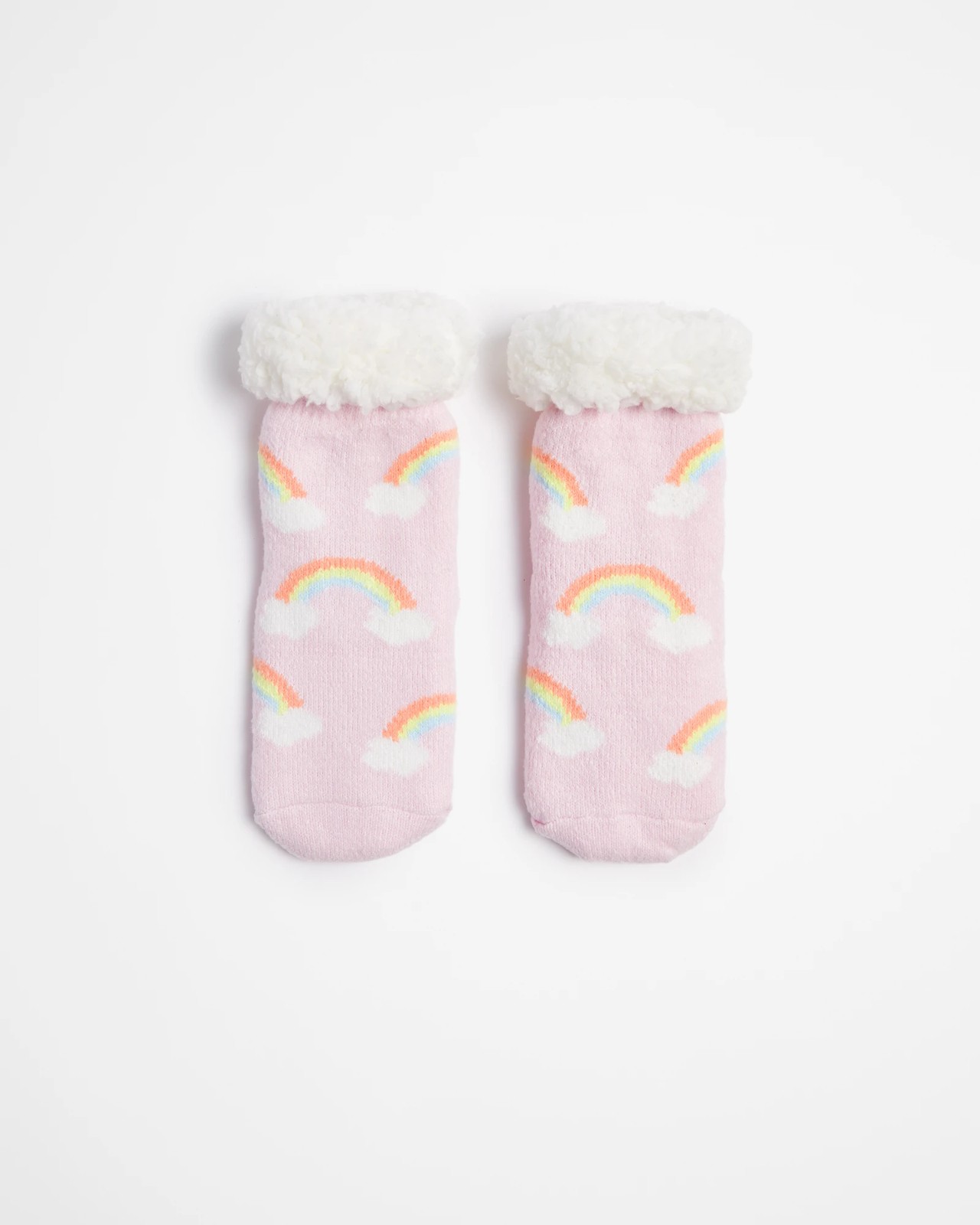 Let your child step into comfort with our Girls Rainbow Sherpa Home Socks. Envelop her feet in its soft fleece that feels like a warm hug. These adorable socks, adorned with a cheerful pink all-over rainbow print, will bring a smile to her face every time she wears them. Get a pair today and let her experience blissful relaxation at home!