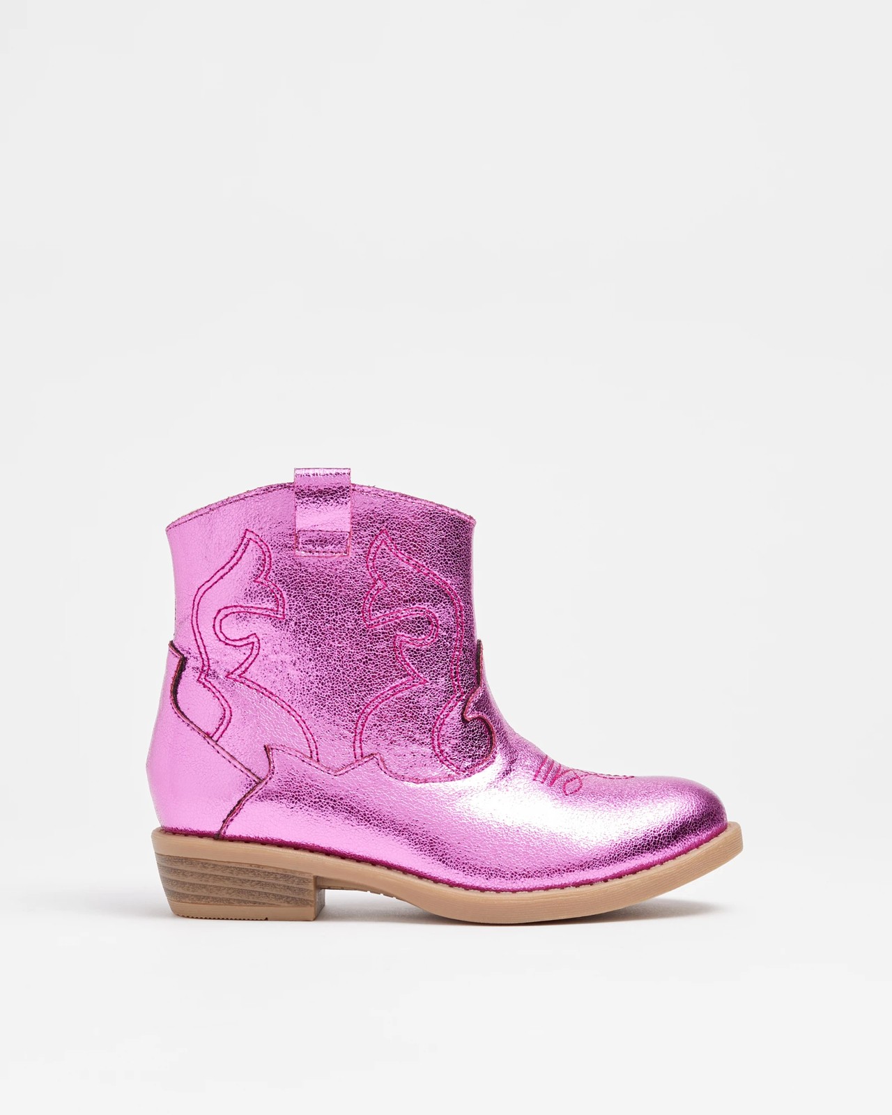 Your child can step out in style with our Girls Senior Metallic Western Boots. Designed with a chic metallic synthetic upper and a classic western stitched design, these boots are perfect for any occasion. The closed round toe and padded footbed ensure comfort all day, while the easy-to-use inner zip and outer pull tab make getting ready a breeze. Boasting a sleek veneer block heel, these boots add a touch of glamour to any outfit. Perfect for girls who love to stand out. Grab a pair now!