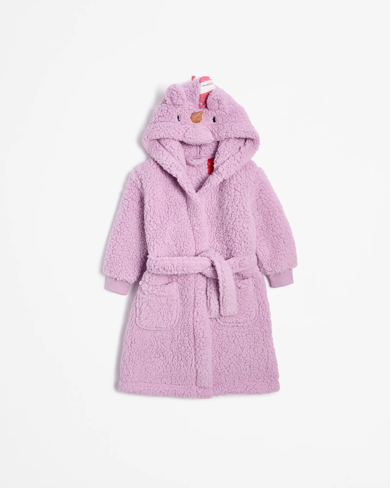 Let your little one dive into magical comfort with this delightful Girls Sherpa Fleece Novelty Dressing Gown. Featuring charming unicorn details like 3D ears, a horn, a mane, and embroidered eyes, it offers both warmth and whimsy. The soft sherpa fleece and roomy fit make it ideal for cosy nights at home, while the hood adds extra snugness. Complete with two front pockets and a secure tie-up, it combines practicality with charm. Give your child this dreamy dressing gown and see their excitement unfold.