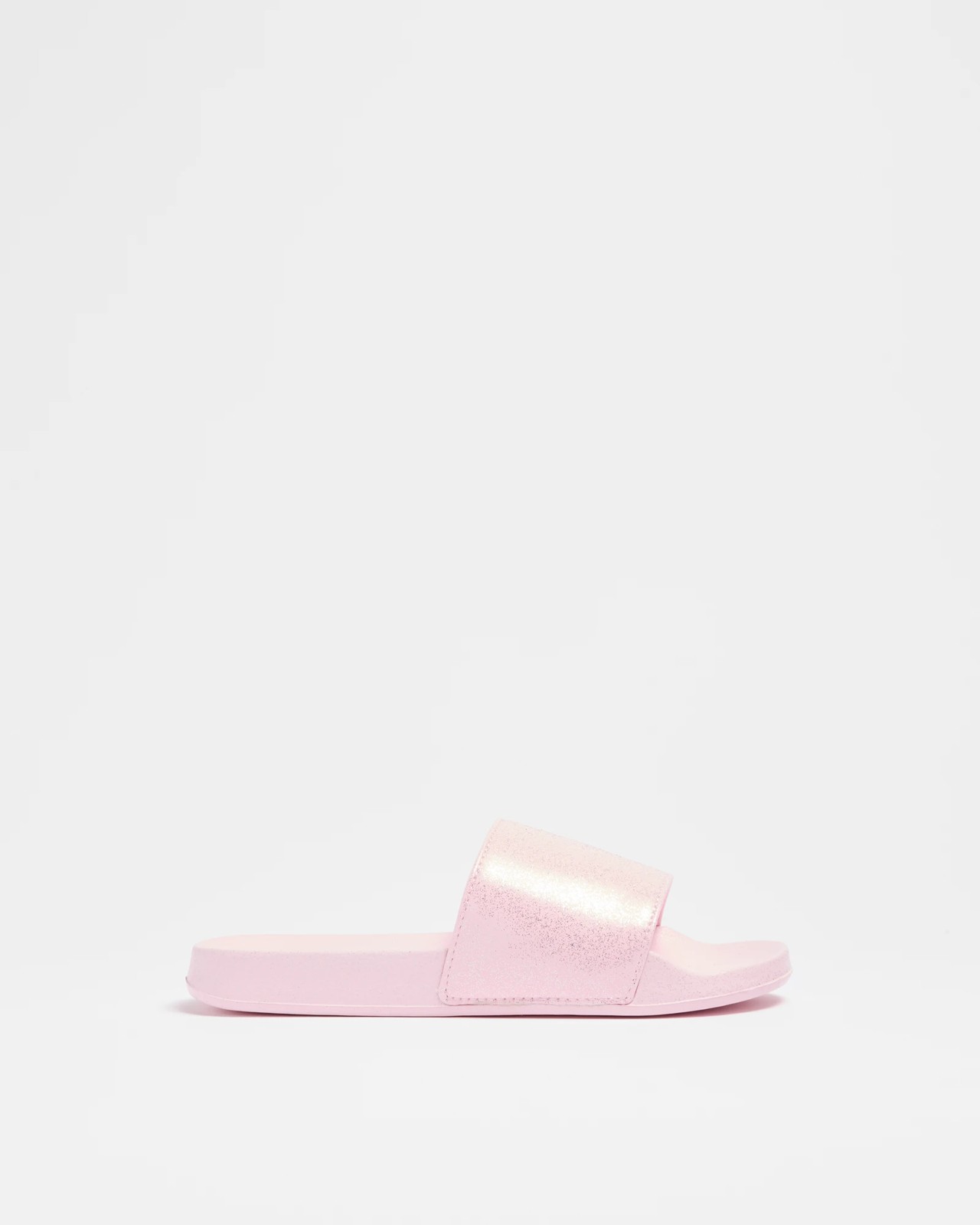 Step into endless fun with our Girls Youth Pool Slides. Highlighted by a vibrant pink glitter design, these slides will quickly become your little one's favourite summer accessory. The open round toe and slip-on style ensure easy wear, while the moulded footbed provides comfort with every step. Featuring a reliable synthetic sole, these slides are perfect for poolside adventures or casual days out. Treat your child to a blend of sparkle and comfort – get yours today!