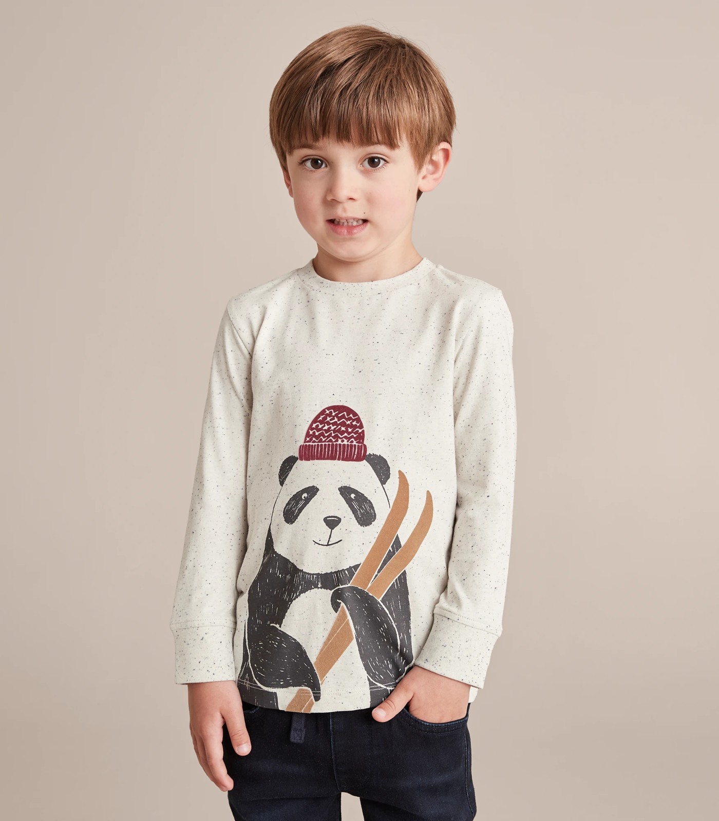 A great addition to his wardrobe comes the Graphic Panda Top in an all over speckle fabric, it features a crew neck, long sleeves and large Panda print to body.