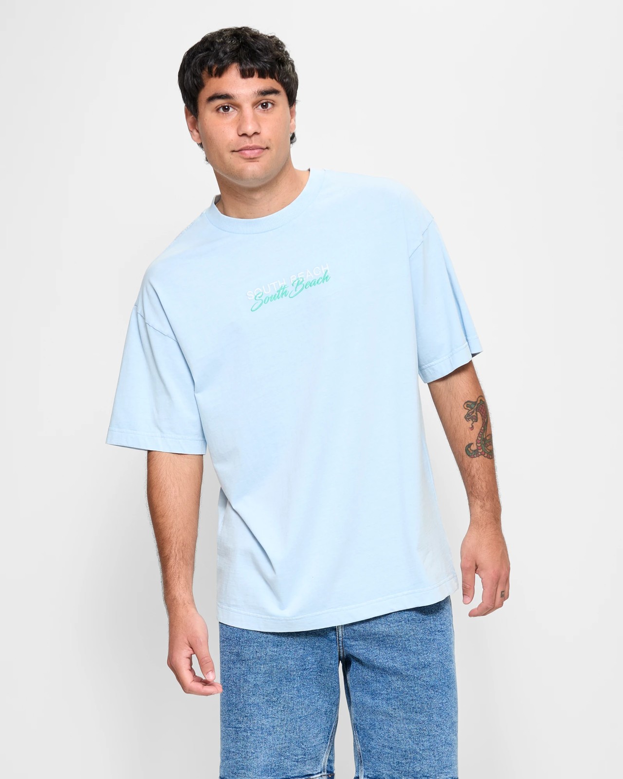 Discover unmatched comfort and style with the Graphic South Beach T-Shirt. Designed from soft cotton material, this t-shirt is both light and breathable, making it ideal for daily wear. Its oversized fit paired with a ribbed crew neckline offers a laid-back yet fashionable look. With short sleeves, embroidered SOUTH BEACH wording on the chest, and a striking graphic on the back, this blue tee is a standout piece. Enhance your wardrobe today with this stylish and comfortable addition!