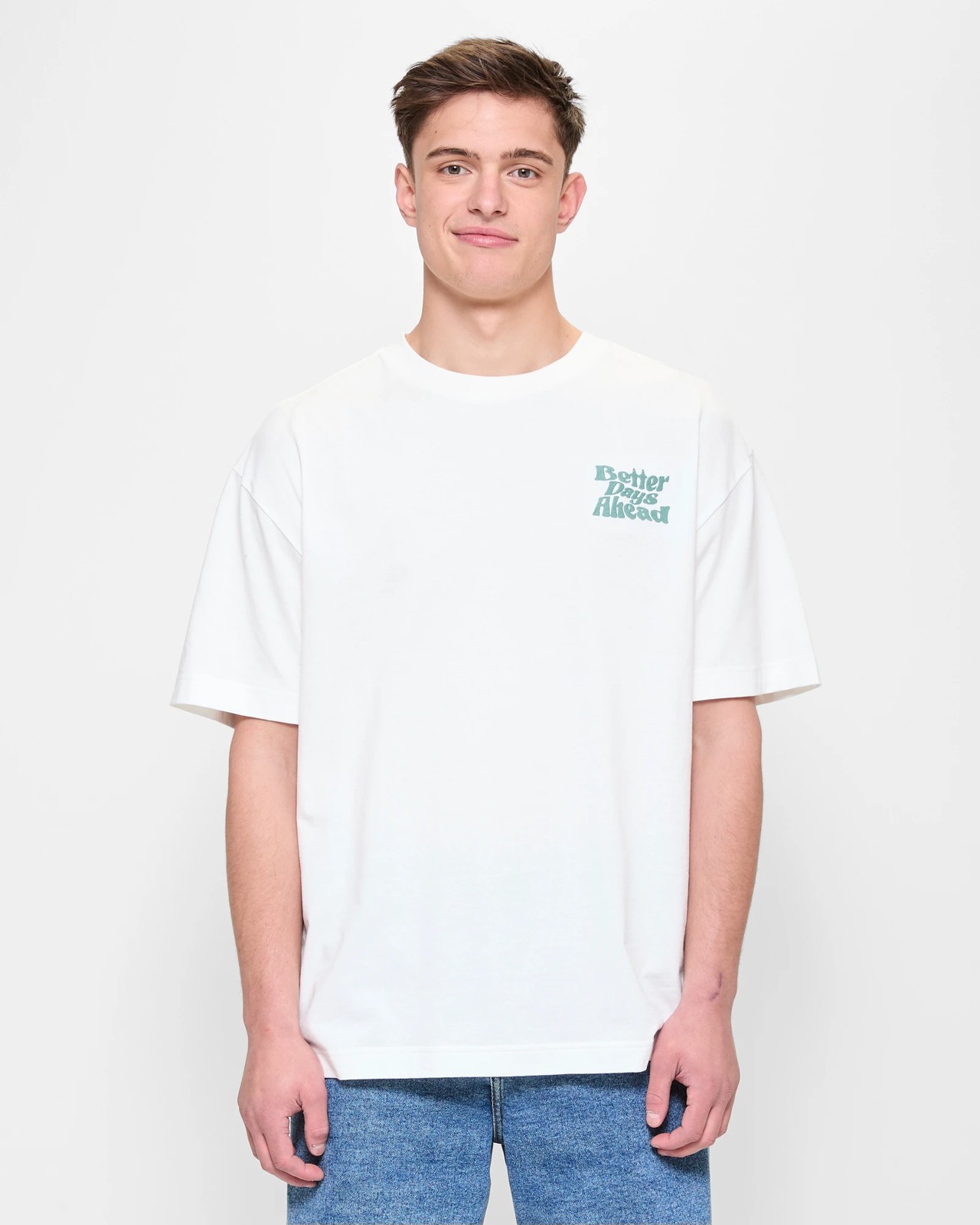 Embroidered BETTER DAYS AHEAD small print on side of chest