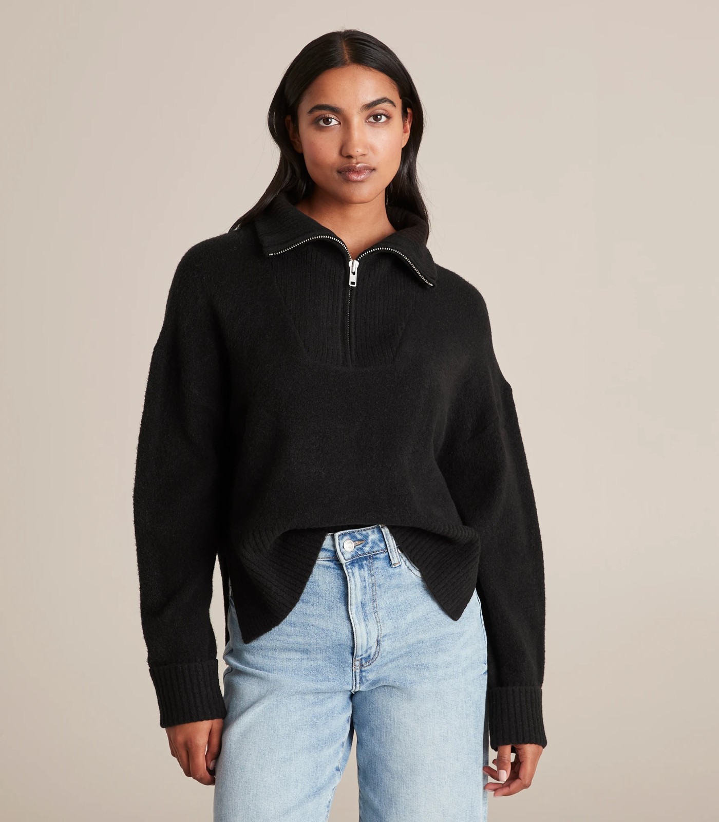 A great jumper for everyday wear, the half zip neck sweater features a high round neckline with a zip down front, long ribbed roll cuff sleeves and a warm woolen blended material.