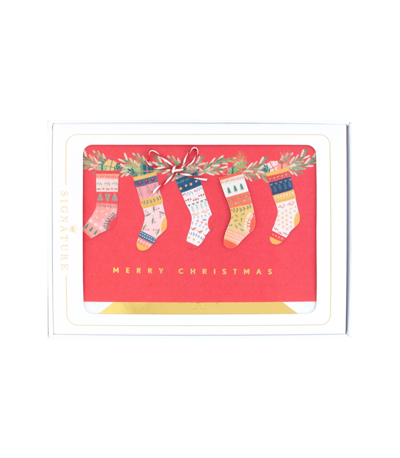 Spread the holiday cheer this season with Hallmark Signature Christmas cards. This delightful festive design features a beautiful illustration of stockings hanging from a Christmas garland, with gold foil highlights.