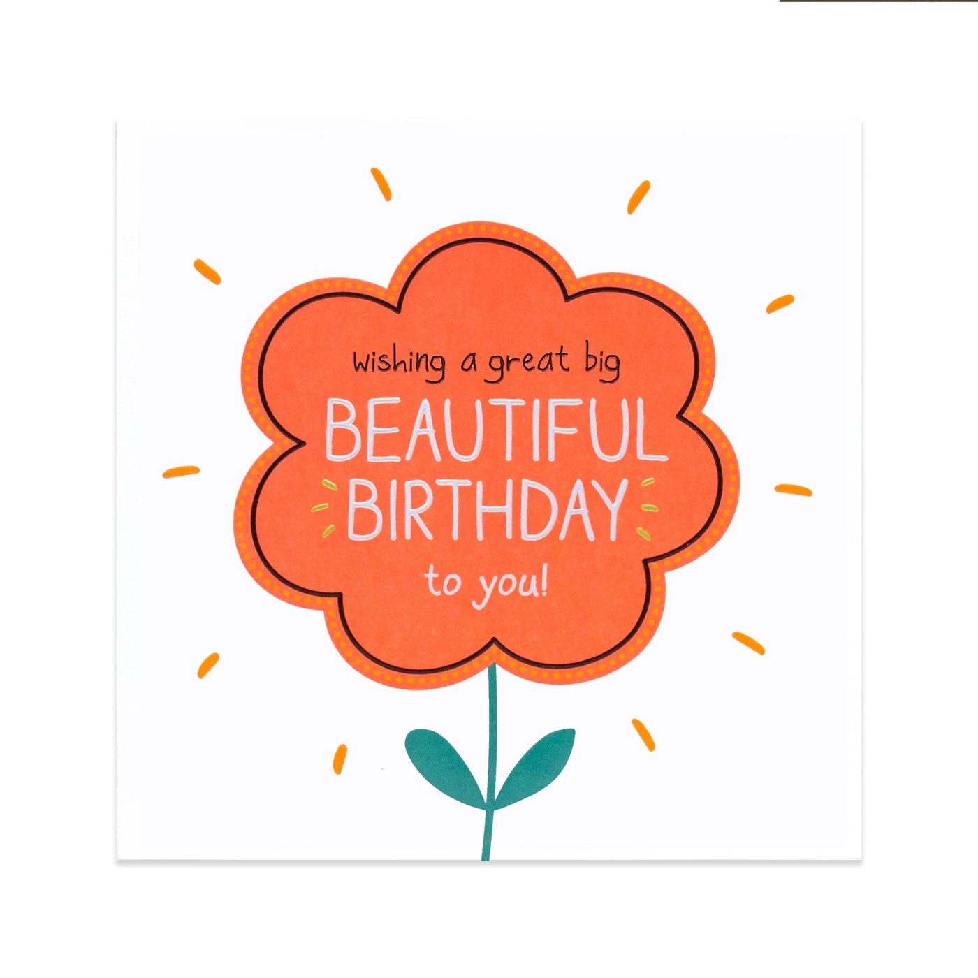 The front of the card features neon highlights, embossed elements, an illustration of a flower and the message 'wishing a great big BEAUTIFUL BIRTHDAY to you!'