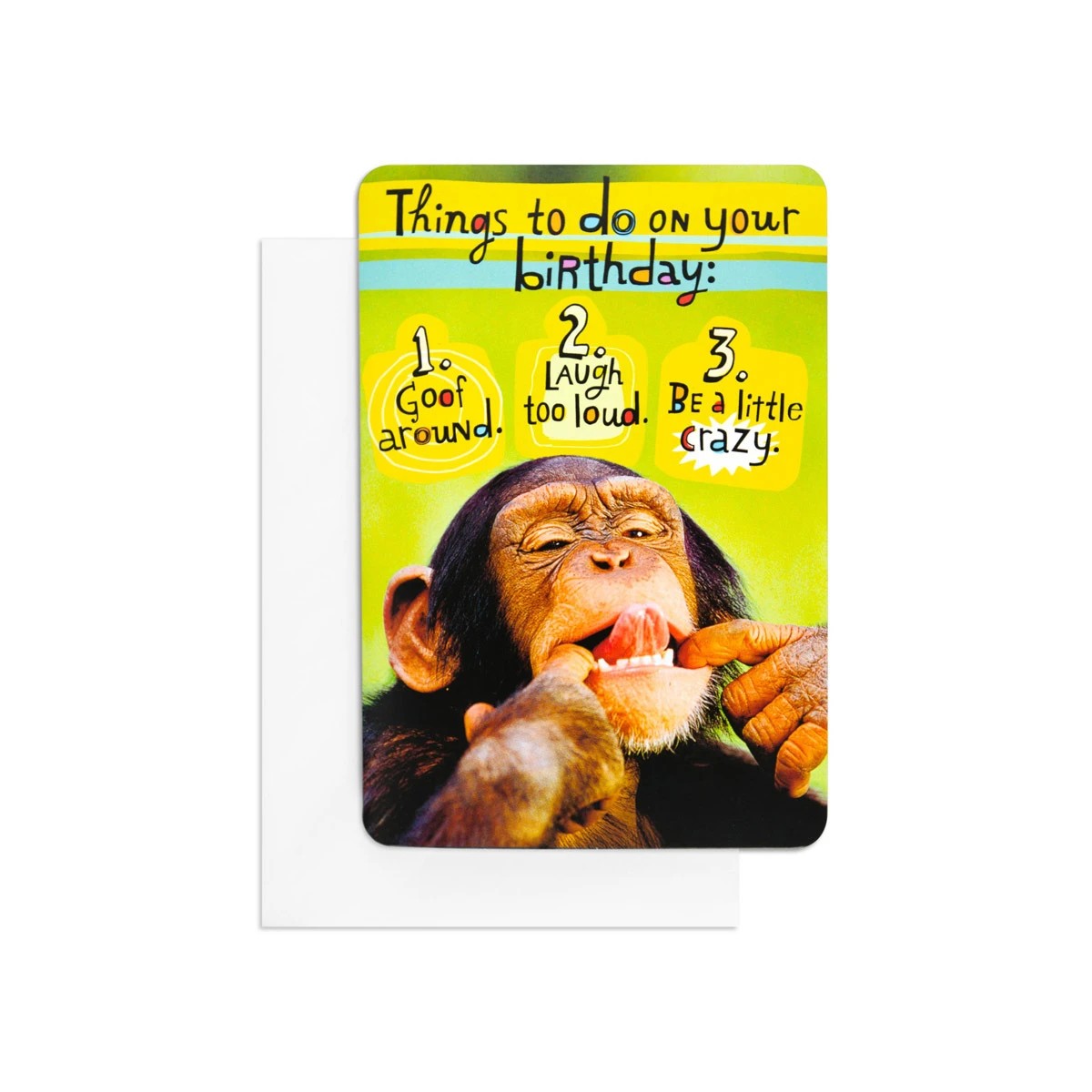 The front of the birthday card features a photo of a monkey pulling a funny face with the message: “Things to do on your birthday: 1. Goof around. 2. Laugh too loud. 3. Be a little crazy.”